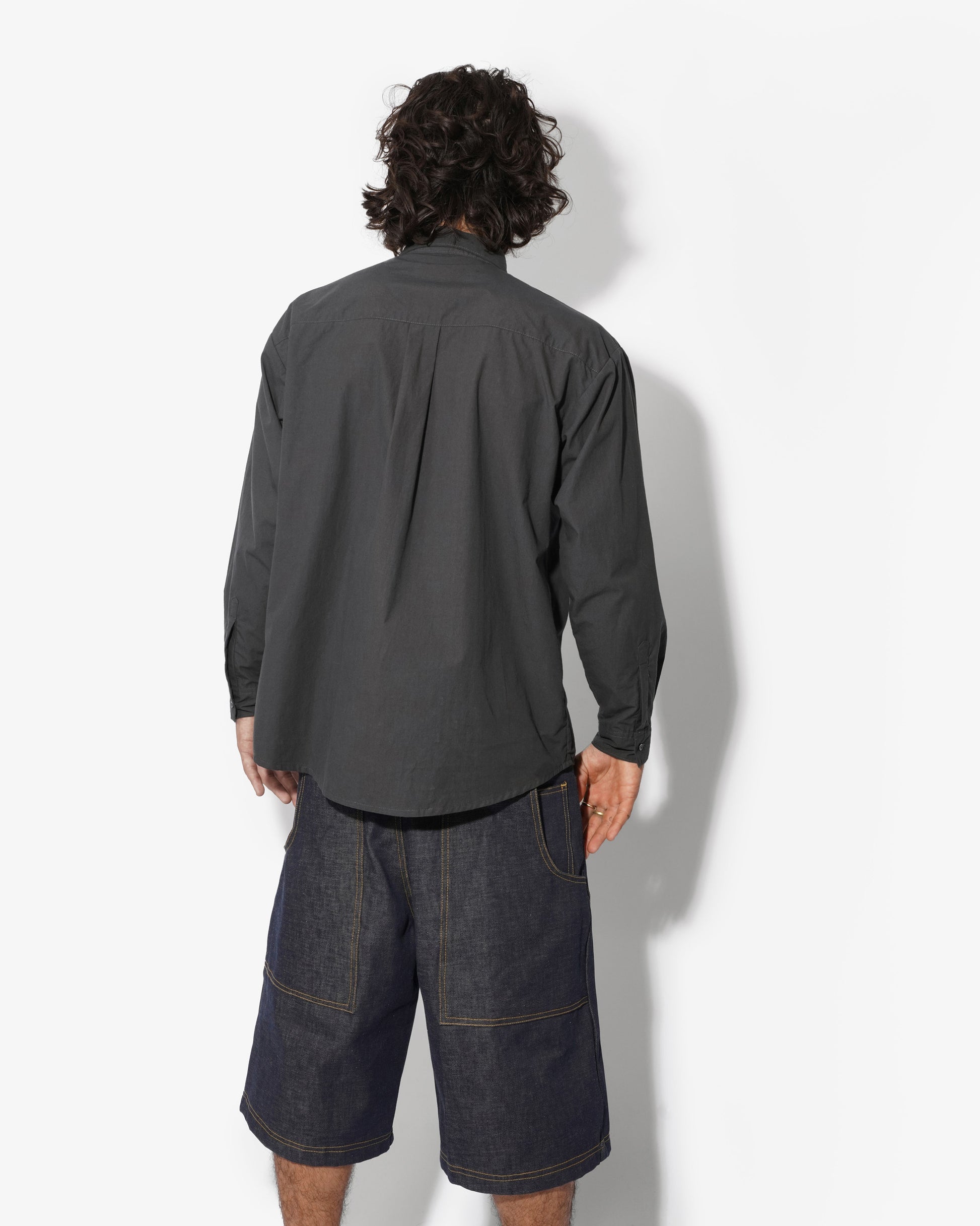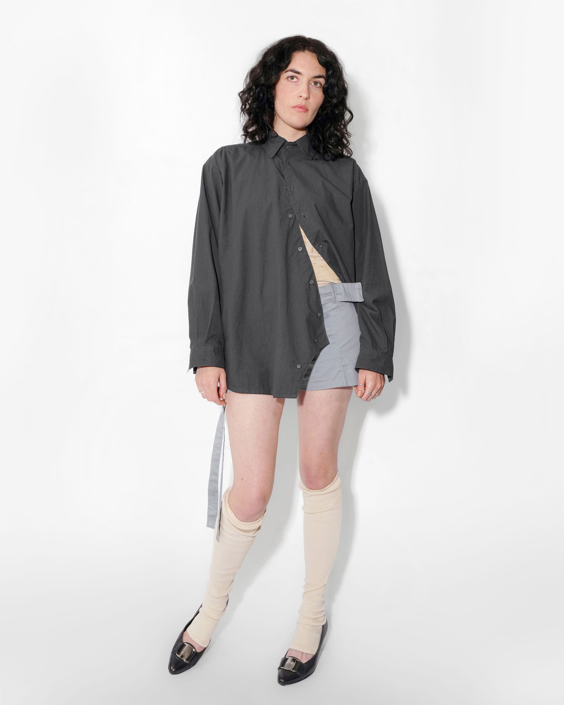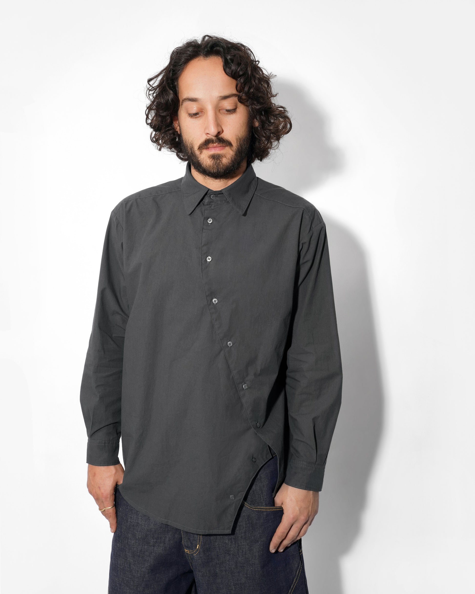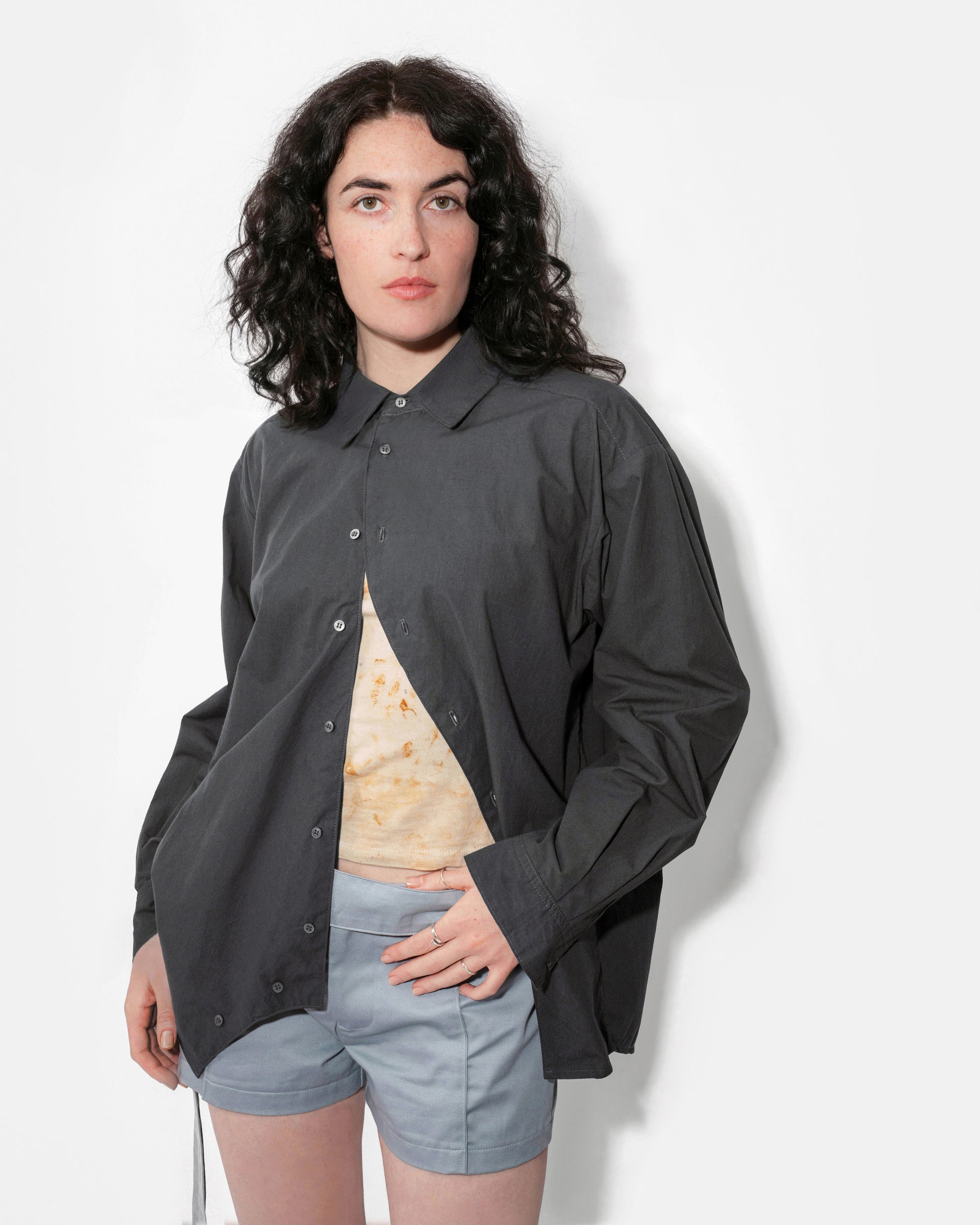 An Ella Mae take on an everyday classic, the Cosmo Button Down features a relaxed fit with asymmetrical buttons. The placket moves diagonally across the body of the shirt and ends with a small arch-shaped opening at the hem, adding a touch of whimsy to this wardrobe staple. Wear it buttoned all the way up, halfway buttoned, or fully open for maximum drape. Crafted in a beautifully washed charcoal cotton with a bit of structure. .