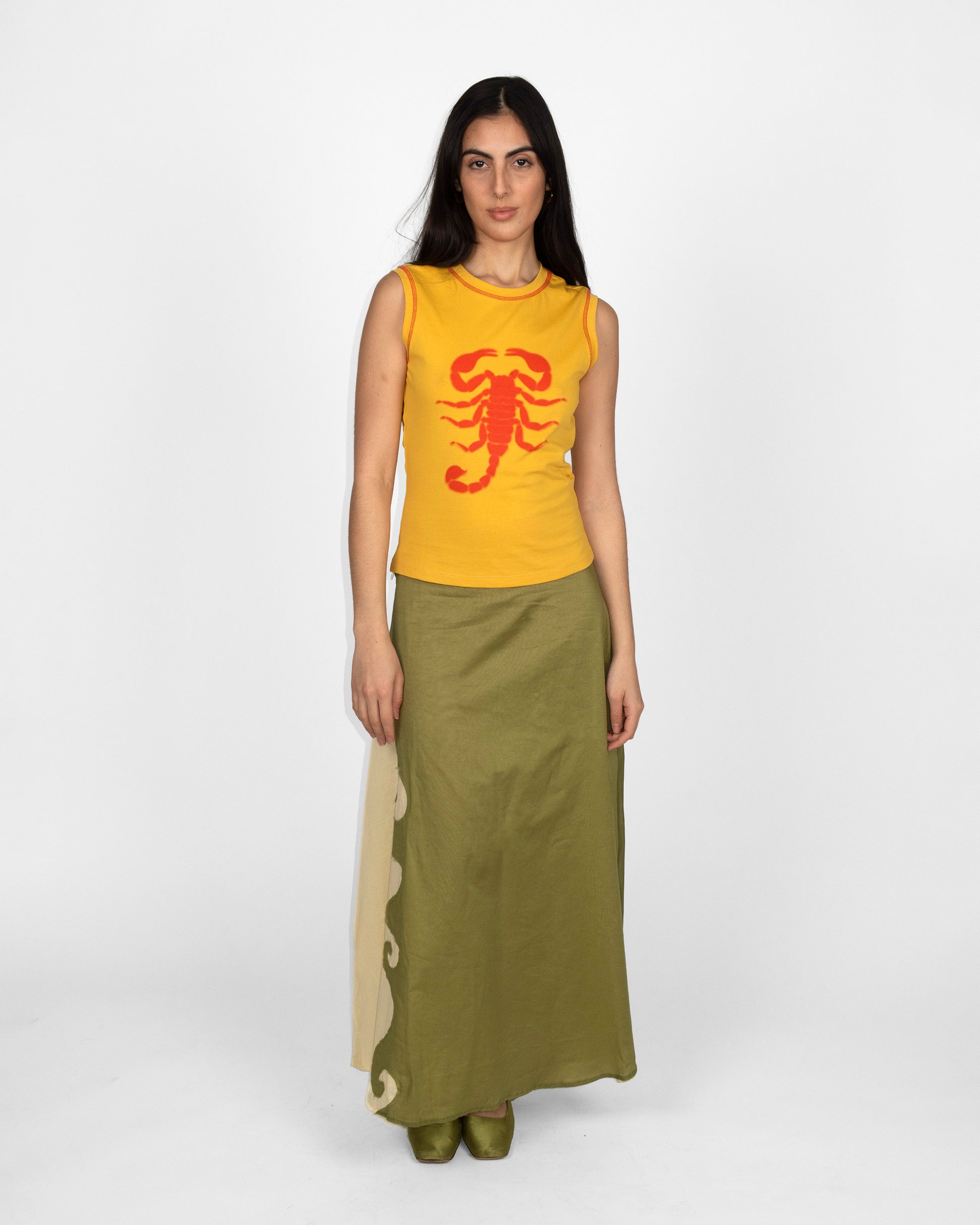 Unfurl the fronds of the Fern Skirt, a collaboration piece with Tyler McGillivary. Two fabrics collide at an asymmetrical, swirling margin to create this colorblocked piece. Made from a light and breezy cotton, it is an a-line skirt with a low rise fit.