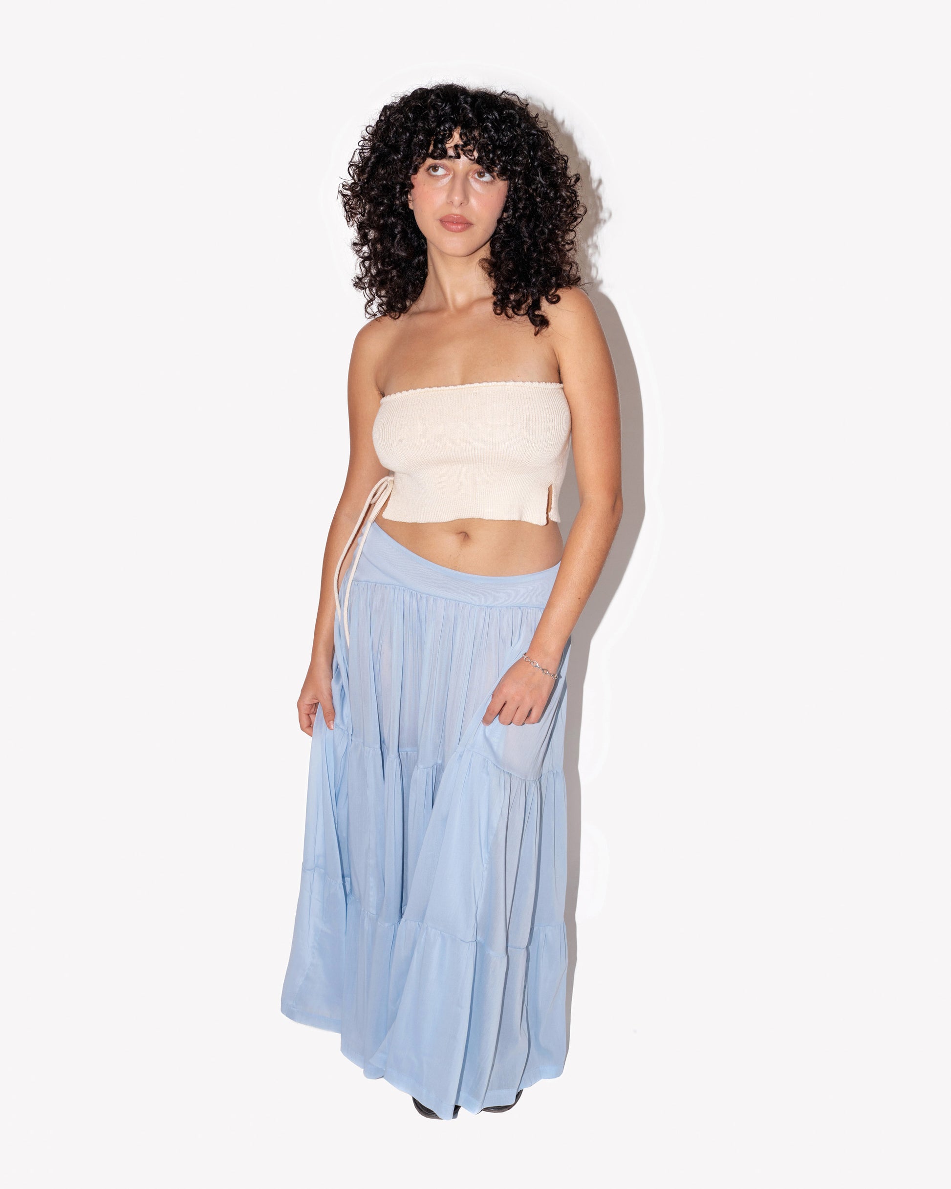 Gathered full length skirt in a fountain of semi sheer ice blue. Curved waistband designed to lie on the low waist. Three tiers of gathered fabric to create full body drape. All fabric is locally sourced deadstock and sustainable.
