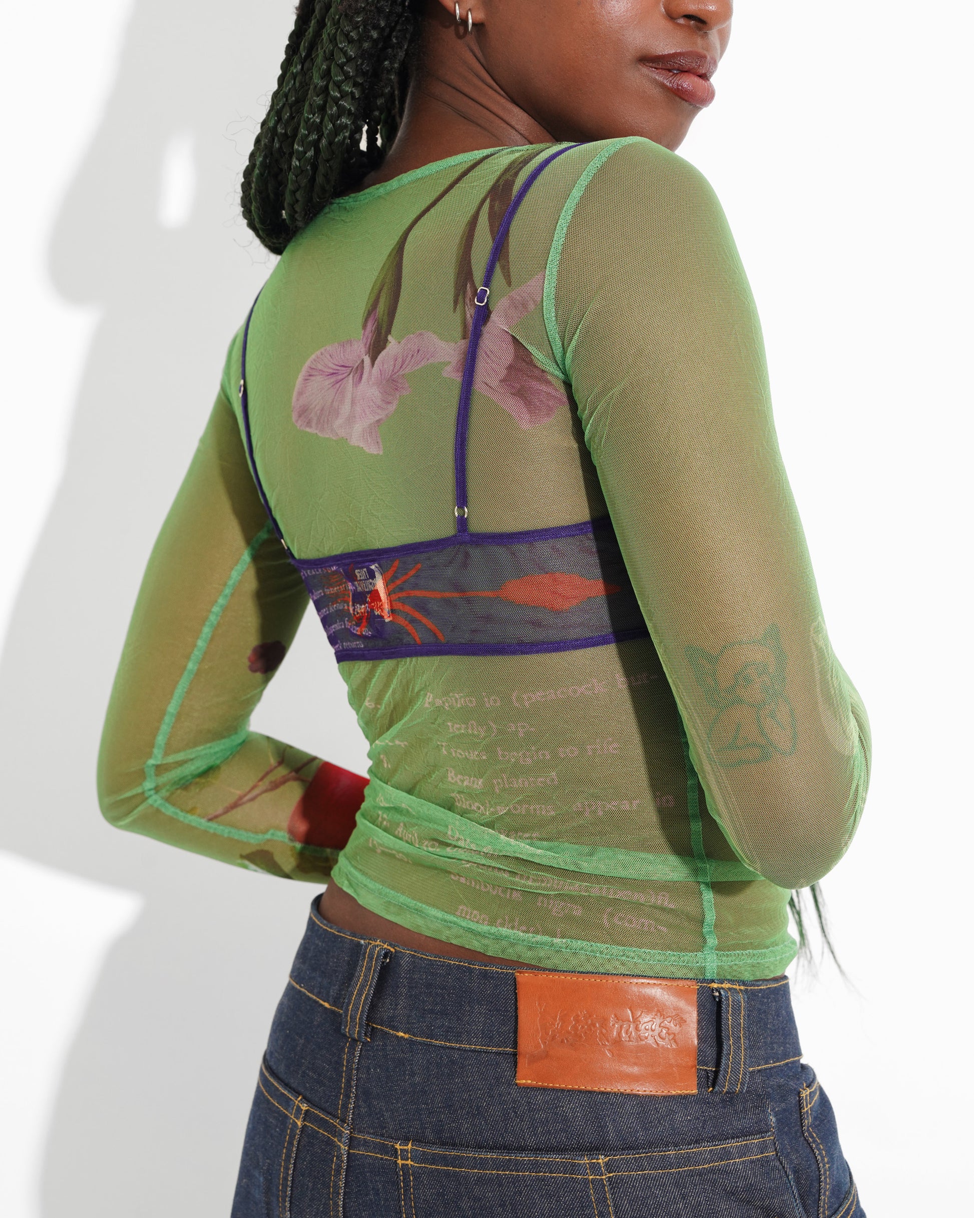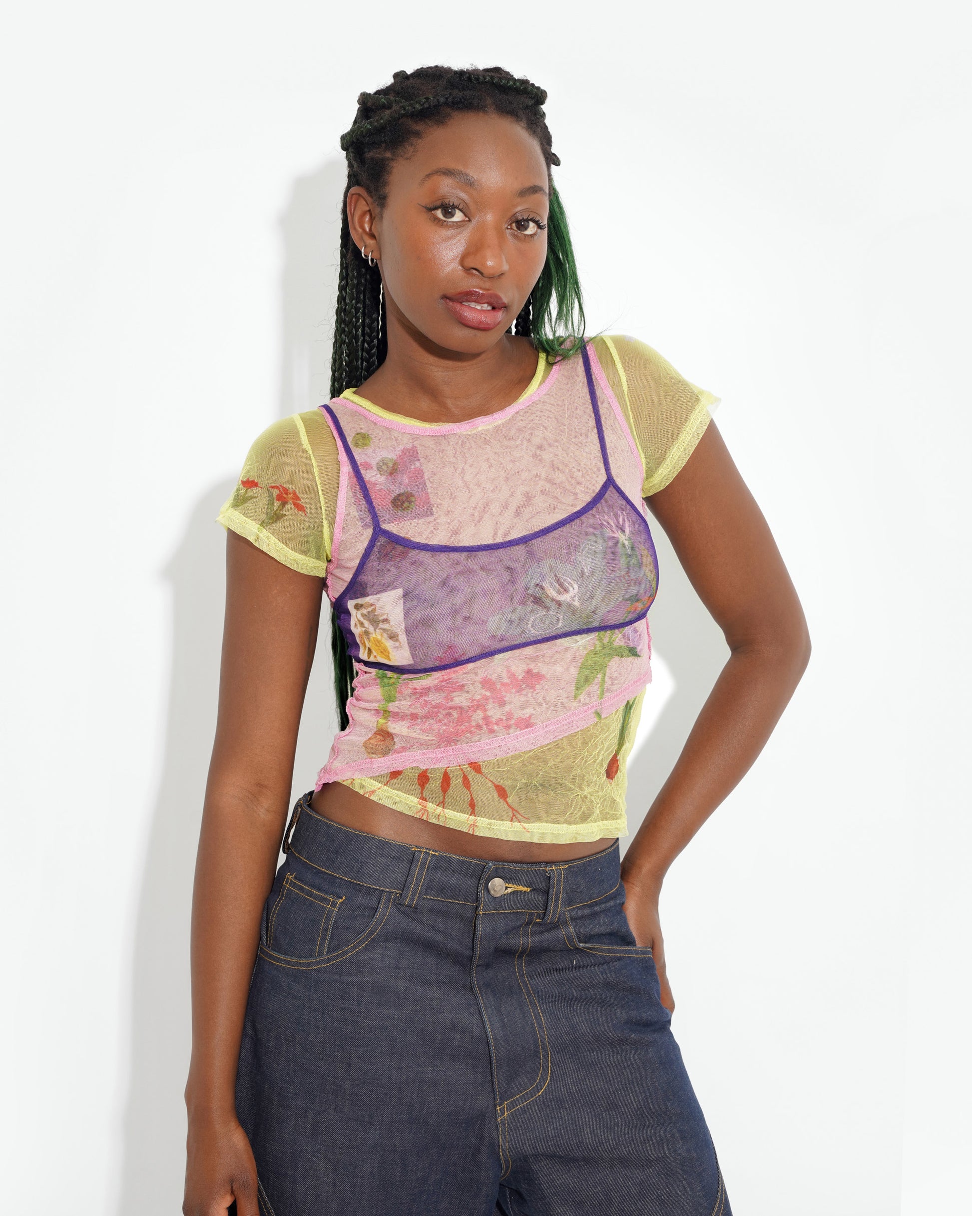 Made in collaboration with Tyler McGillivary, the Life Cycle Top is a four-piece crinkle mesh set that begs to be layered. It features the highlights of your high school biology textbook; The Life Cycle Top tells the story of a plant from seed to flower to fruit. Included in the set are one bralette, one long sleeve, one t-shirt, and one tank. Varying colors, hemlines, sleeve lengths, and pattern layouts make layering a dream.