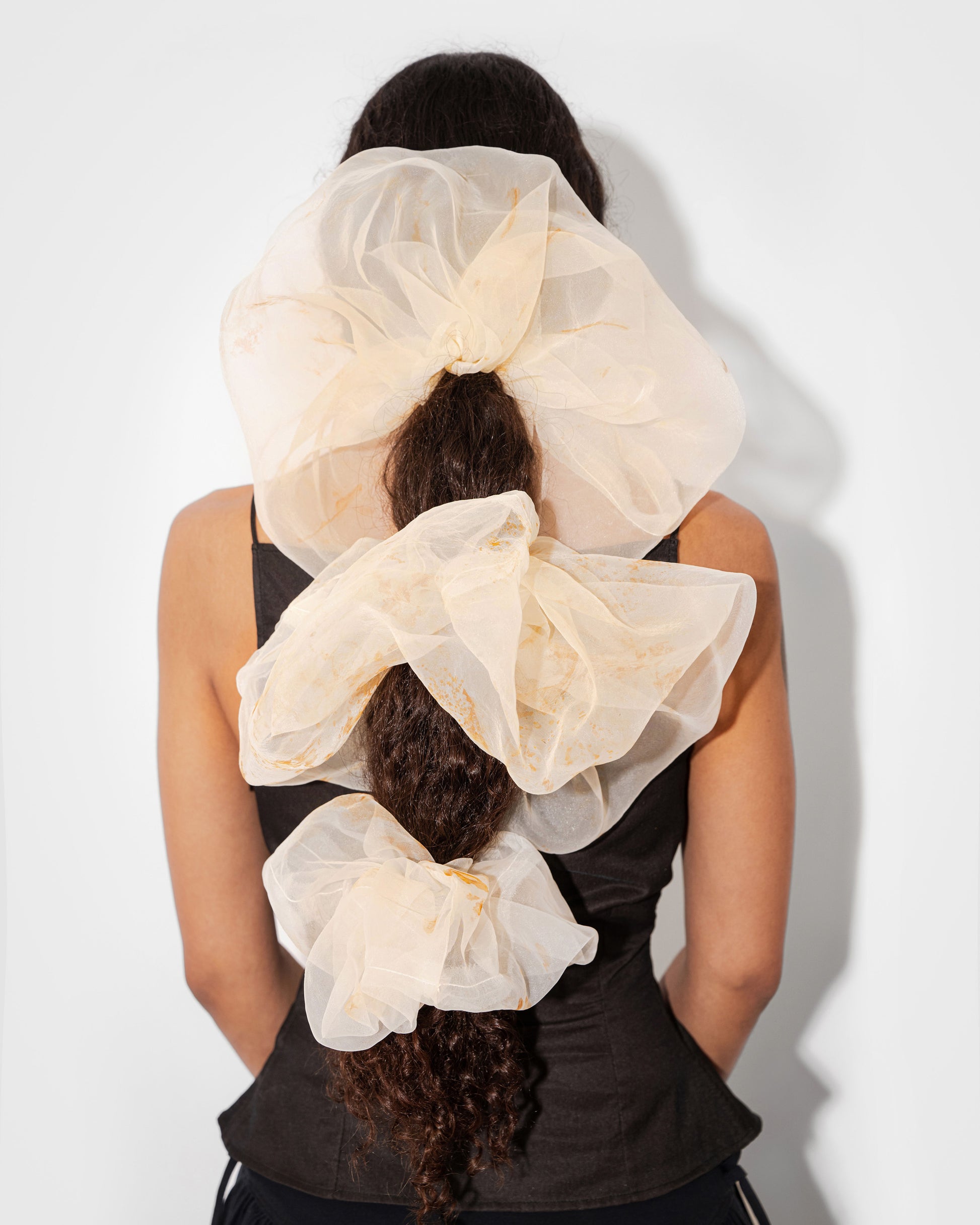 A luminous organza scrunchie naturally dyed with rust. Reminiscent of a piece of sea glass with a whisper of warmth from the rusty tones, the translucent fabric instantly adds an ethereal glow to any look.