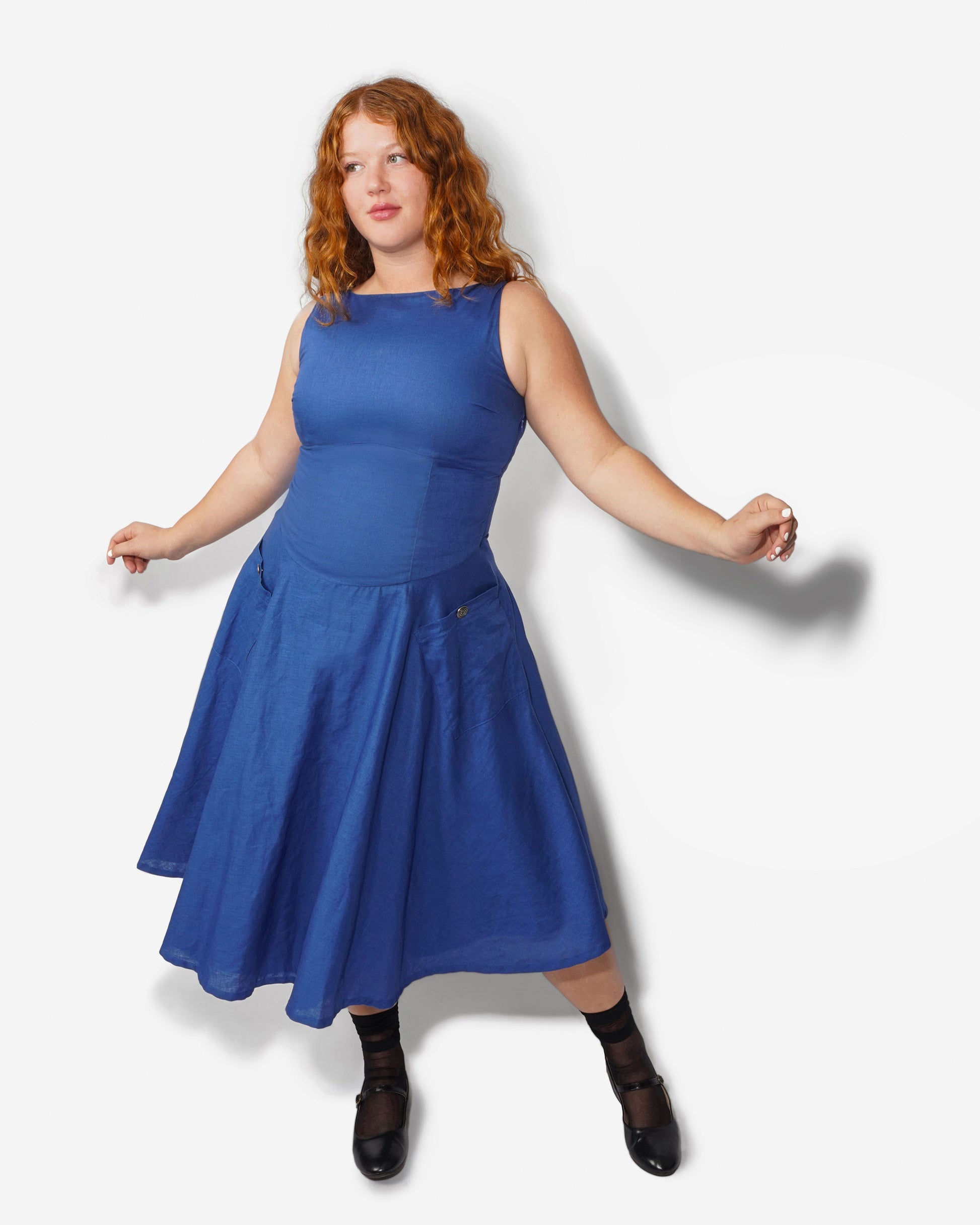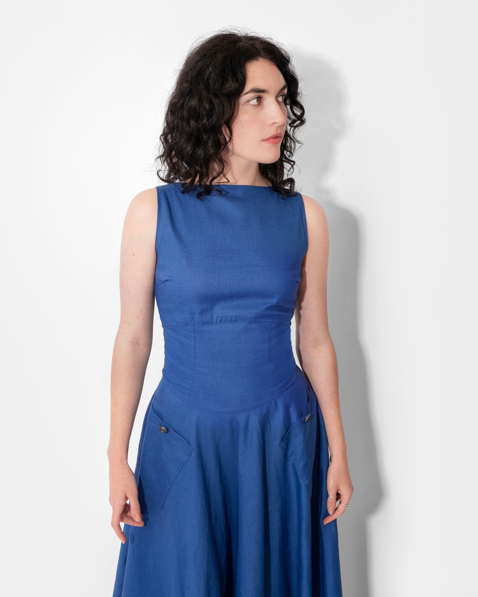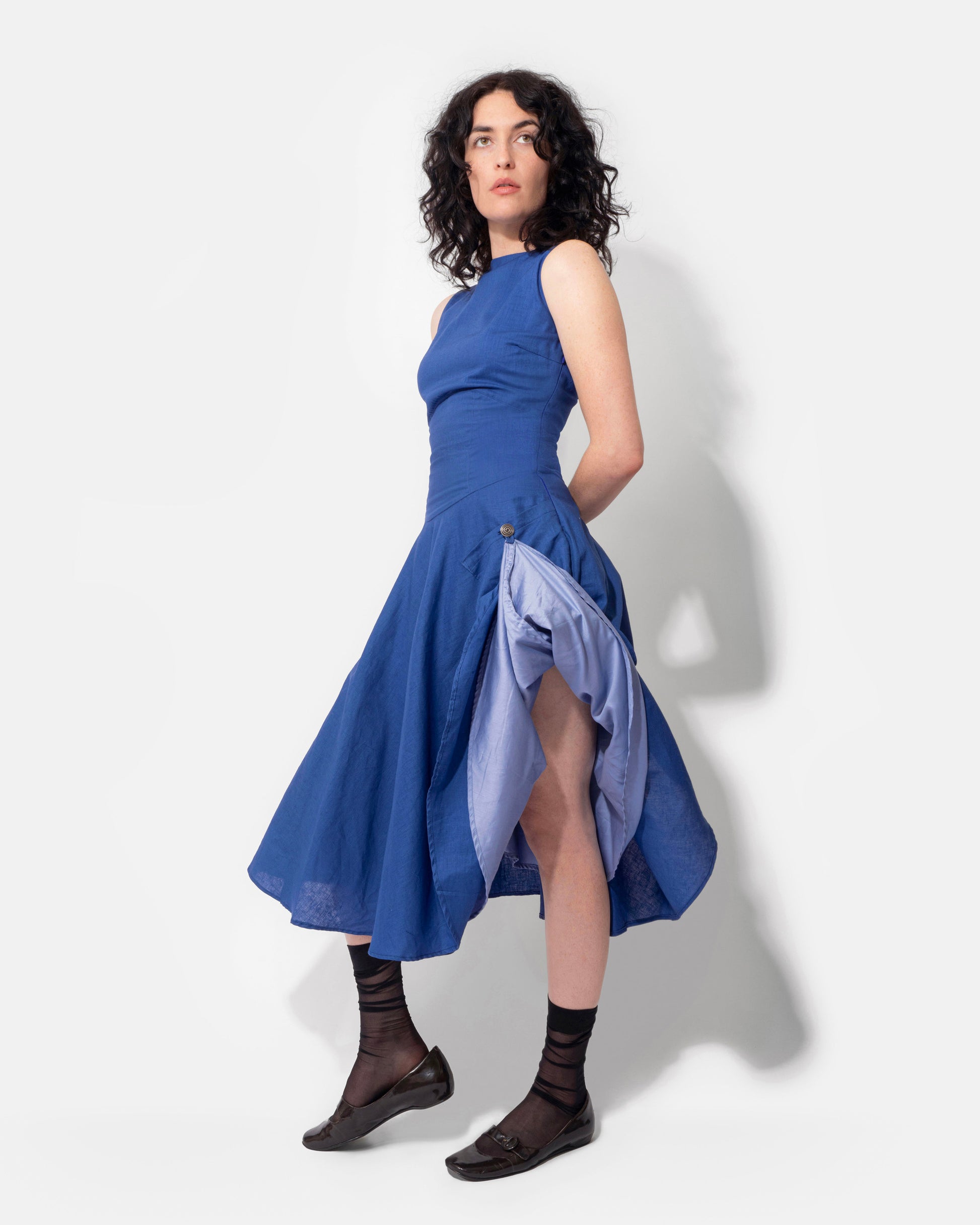 With a fitted, corset-inspired bodice and a full circle skirt, the Meadow Dress is an ode to time spent twirling through sun-lit meadows. It has a boat neckline, silky cotton lining, and two pockets with spiral metal button closures. There is a loop along the bottom hem allowing the skirt to be picked up and attached to one of the buttons, revealing the contrasting lighter blue lining.