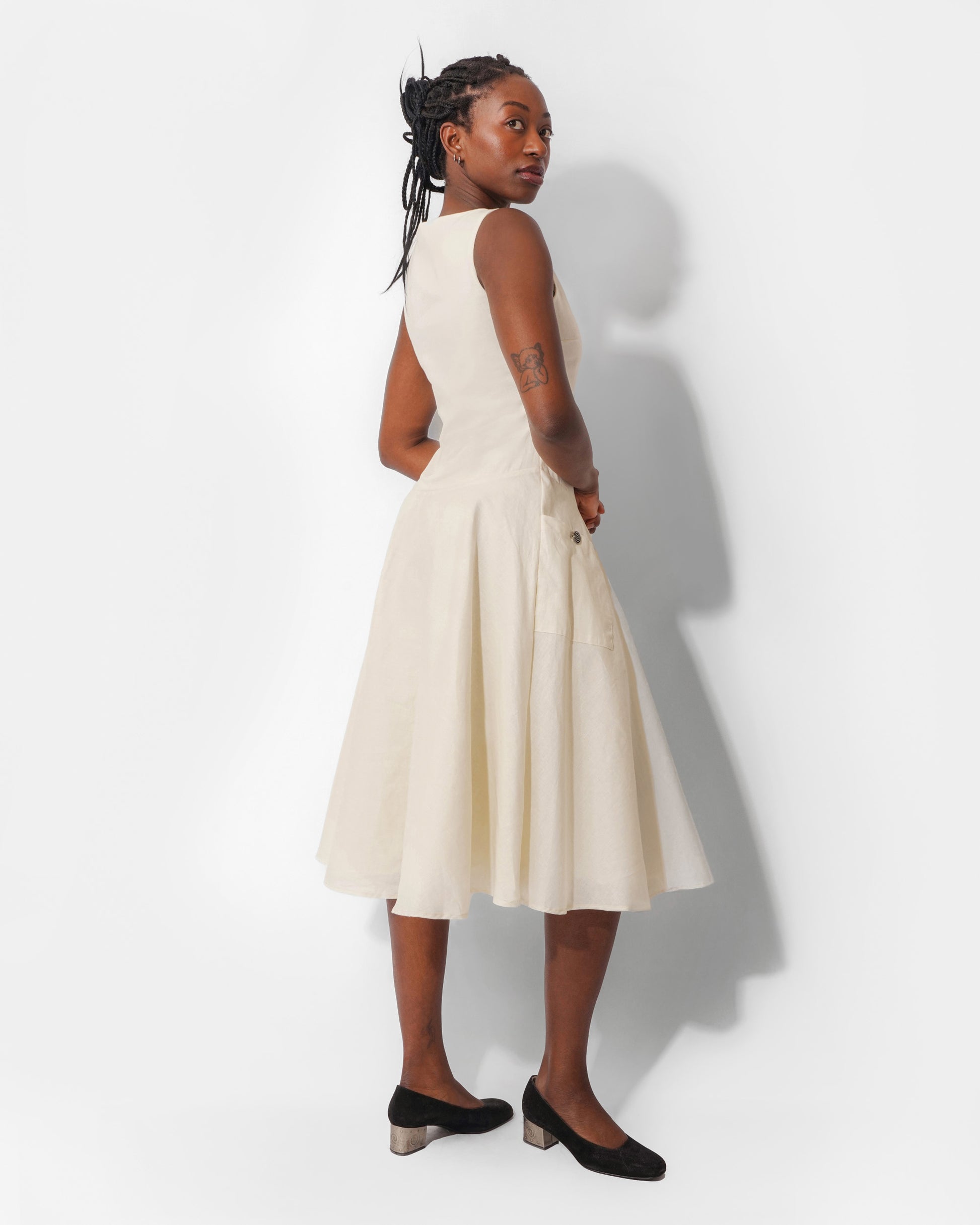 With a fitted, corset-inspired bodice and a full circle skirt, the Meadow Dress is an ode to time spent twirling through sun-lit meadows. It has a boat neckline, silky cotton lining, and two pockets with spiral metal button closures. There is a loop along the bottom hem allowing the skirt to be picked up and attached to one of the buttons.