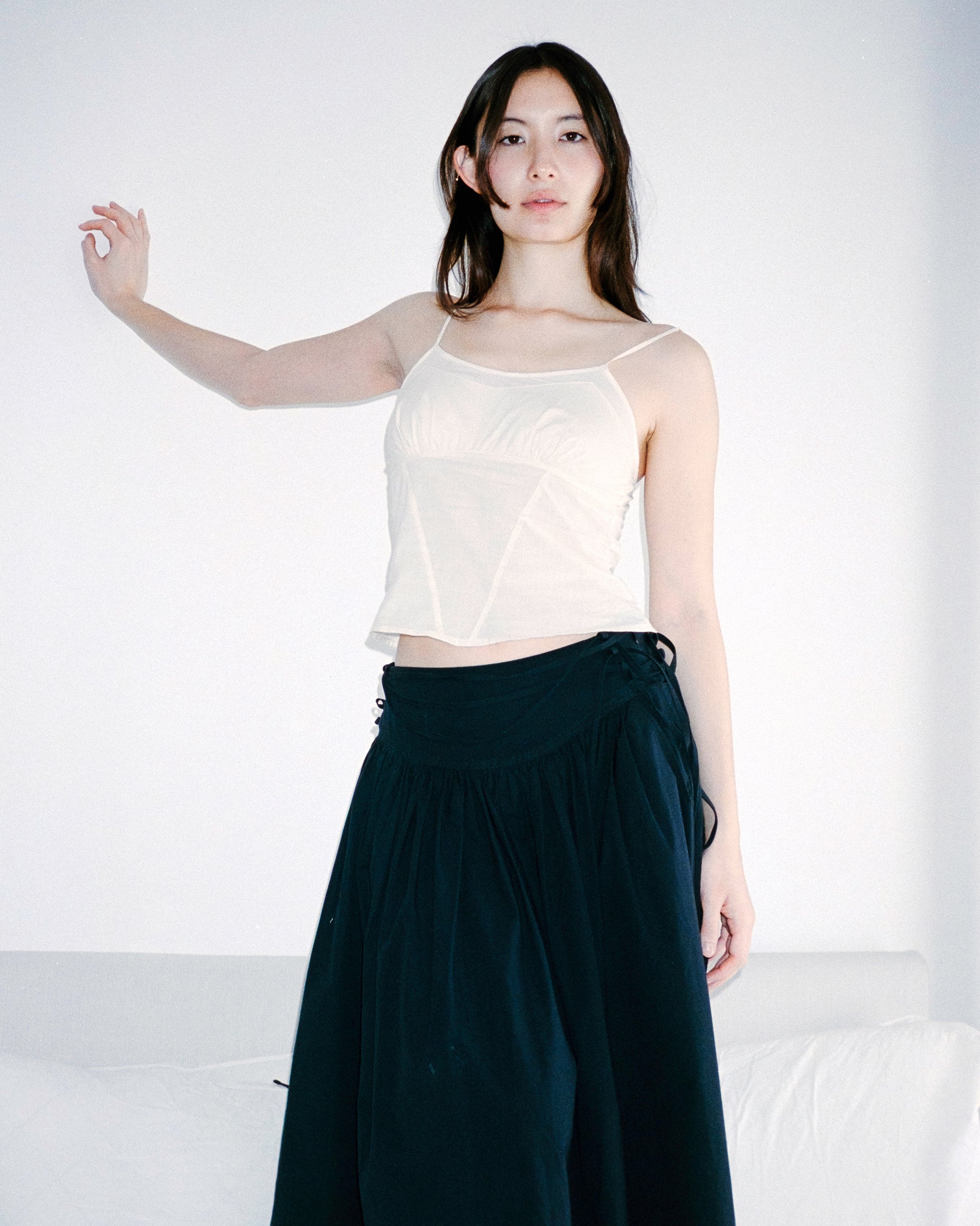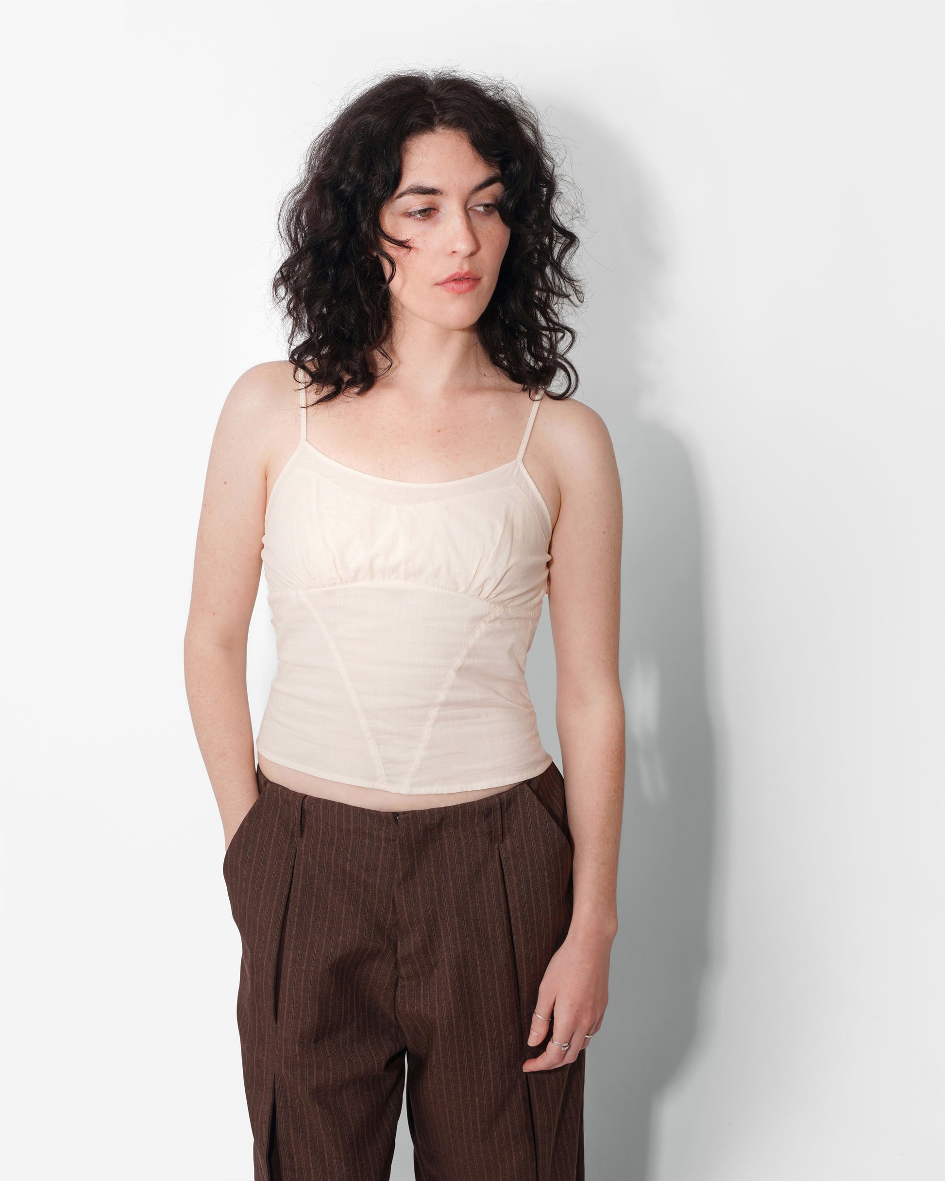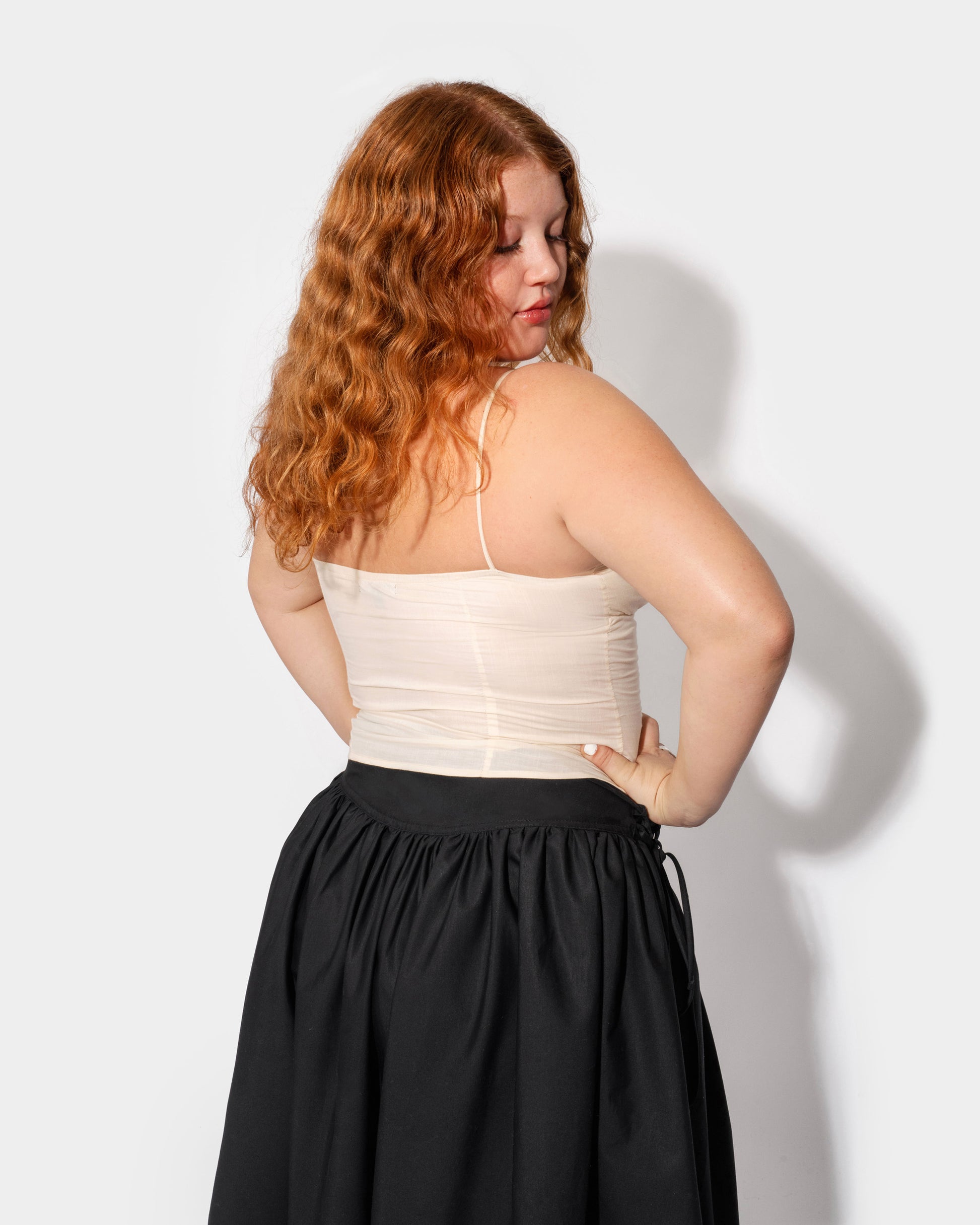 Meet our new go to tank, The Pearl Camisole. Features an ultra-flattering fit with french seams running down the bodice and a subtle gather at the bust. Crafted from a semi-translucent cotton fabric with a doubly lined bust. Elastic at the back makes for an easy, comfortable fit. Designed to pair perfectly with spring picnics and any Ella Mae bottom.