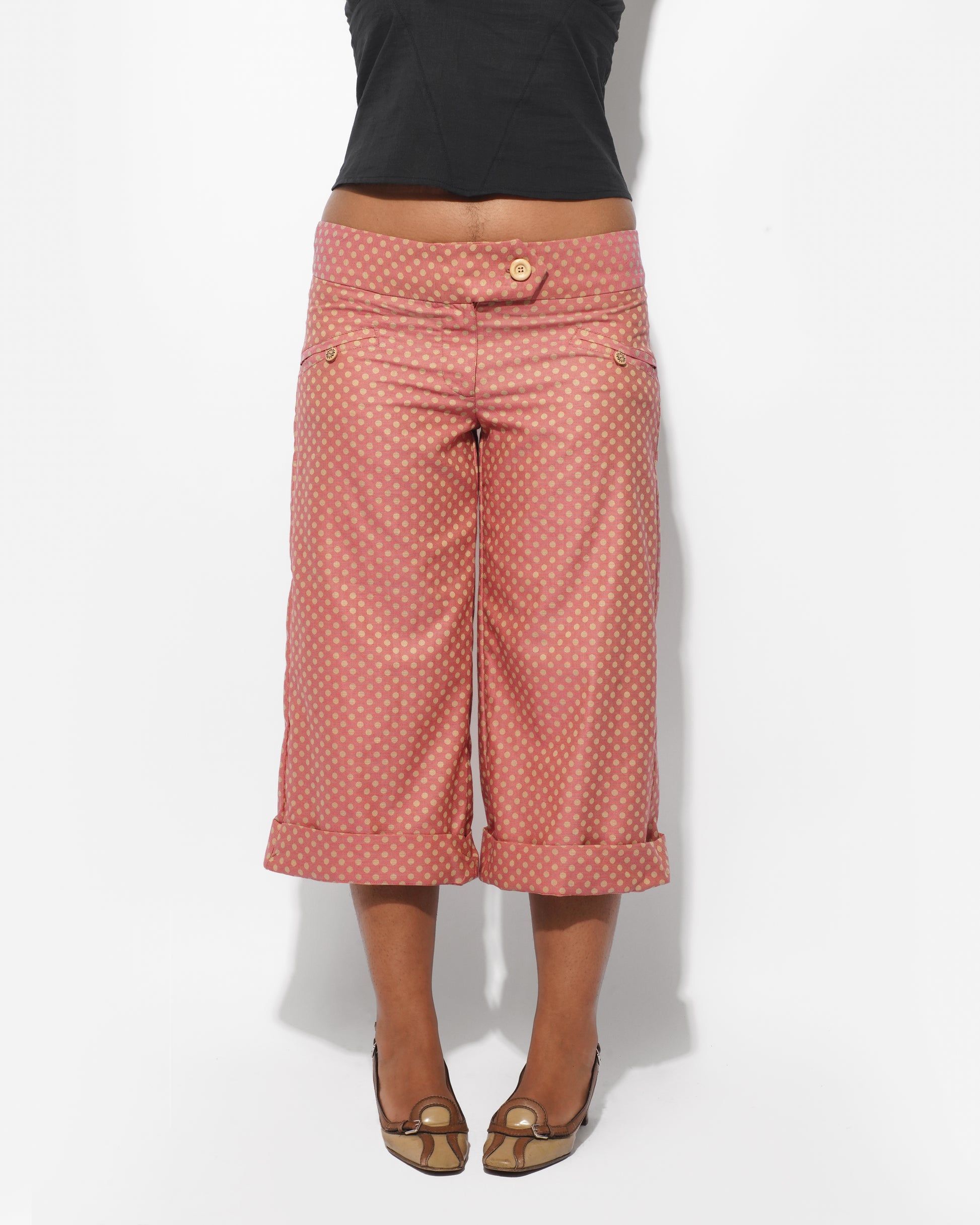 Embody pure whimsy in the Poppy Culottes. This low rise, wide leg capri is sewn from a woven polka dot cotton that invites pattern mixing. An overlapping waistband with a triangular edge and off-center button give them an extra element of eccentricity. Complete with slanted welt pockets, a cuffed hem, and wooden buttons, your childhood art teacher would’ve killed for these.