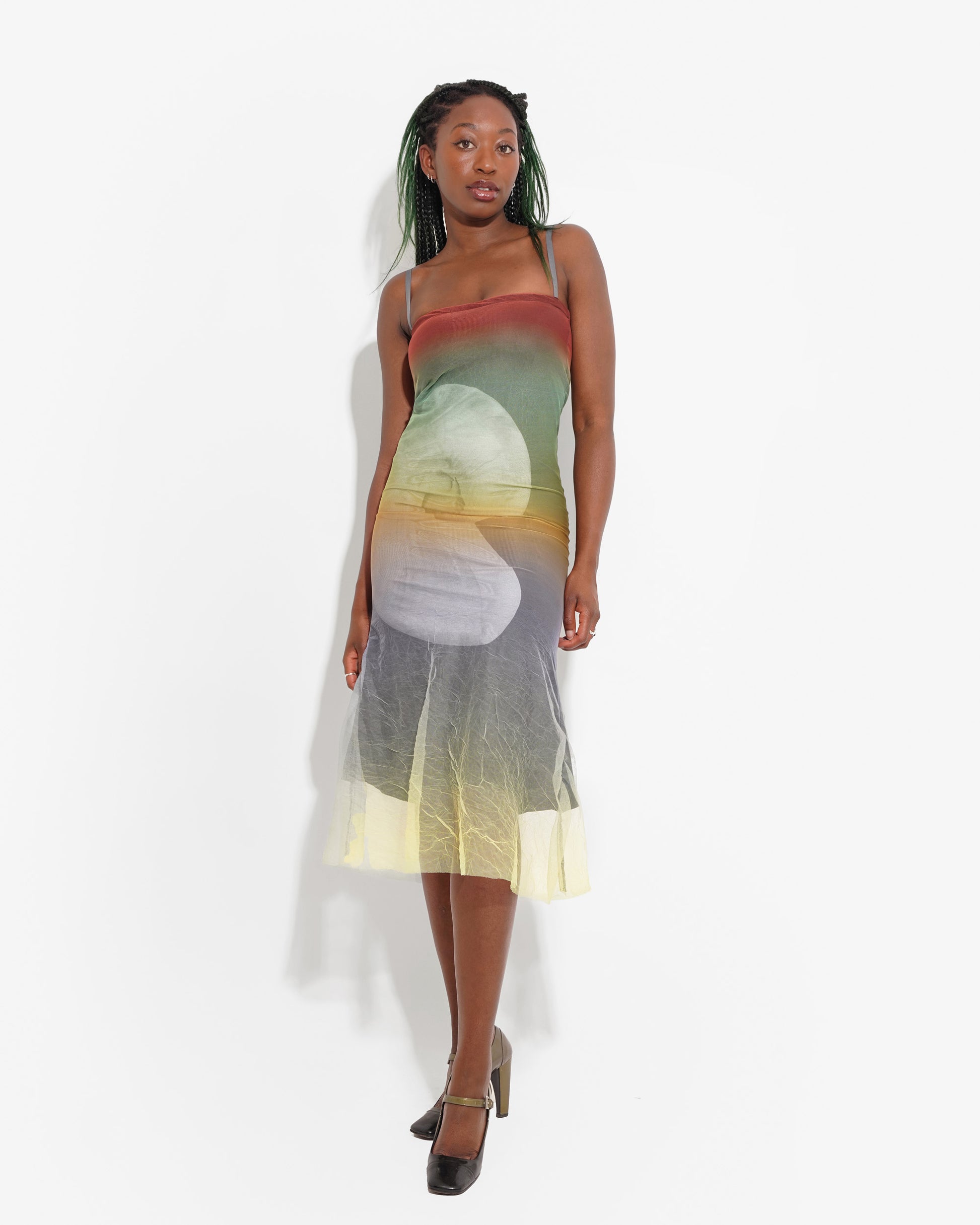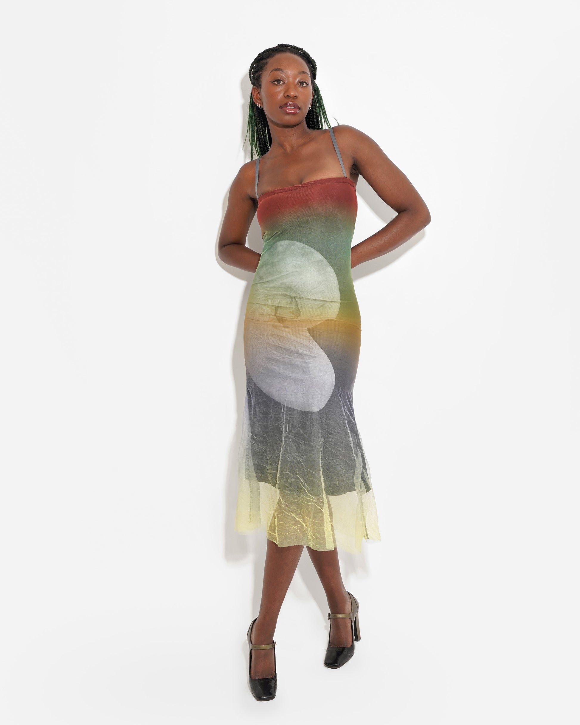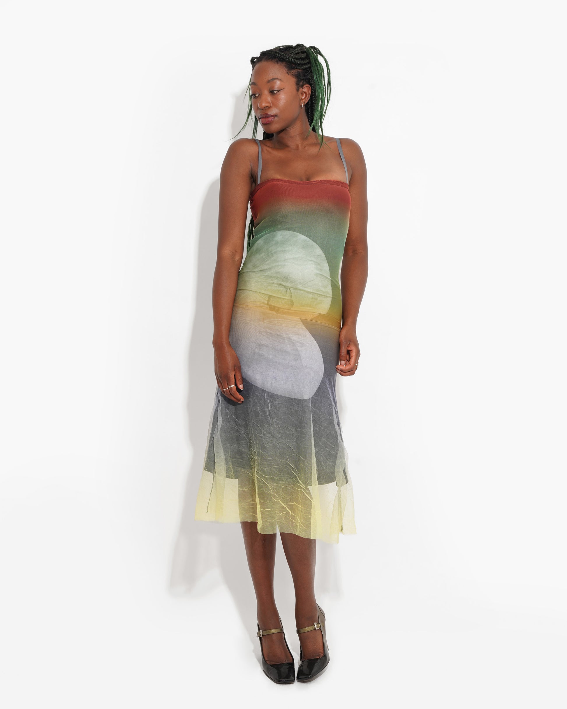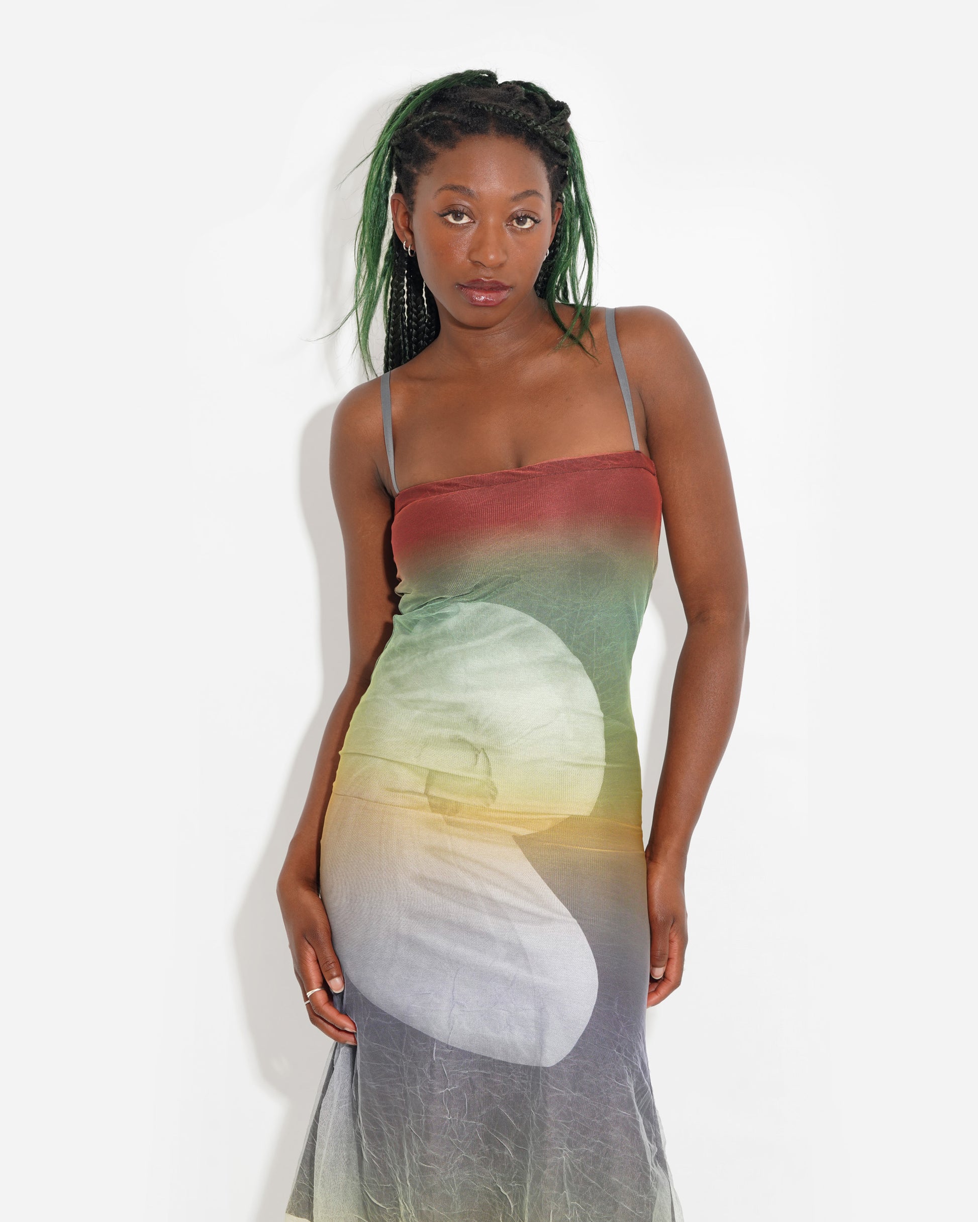 An Ella Mae x Tyler McGillivary daydream; the Rainbow Fossil Dress. A multicolored crinkle mesh overlays the print of a seashell, emulating the iridescent gemstone that forms on the fossilized shells of ammonite. The Rainbow Fossil Dress is made from a stretchy mesh and falls at a midi length for a flattering fit.