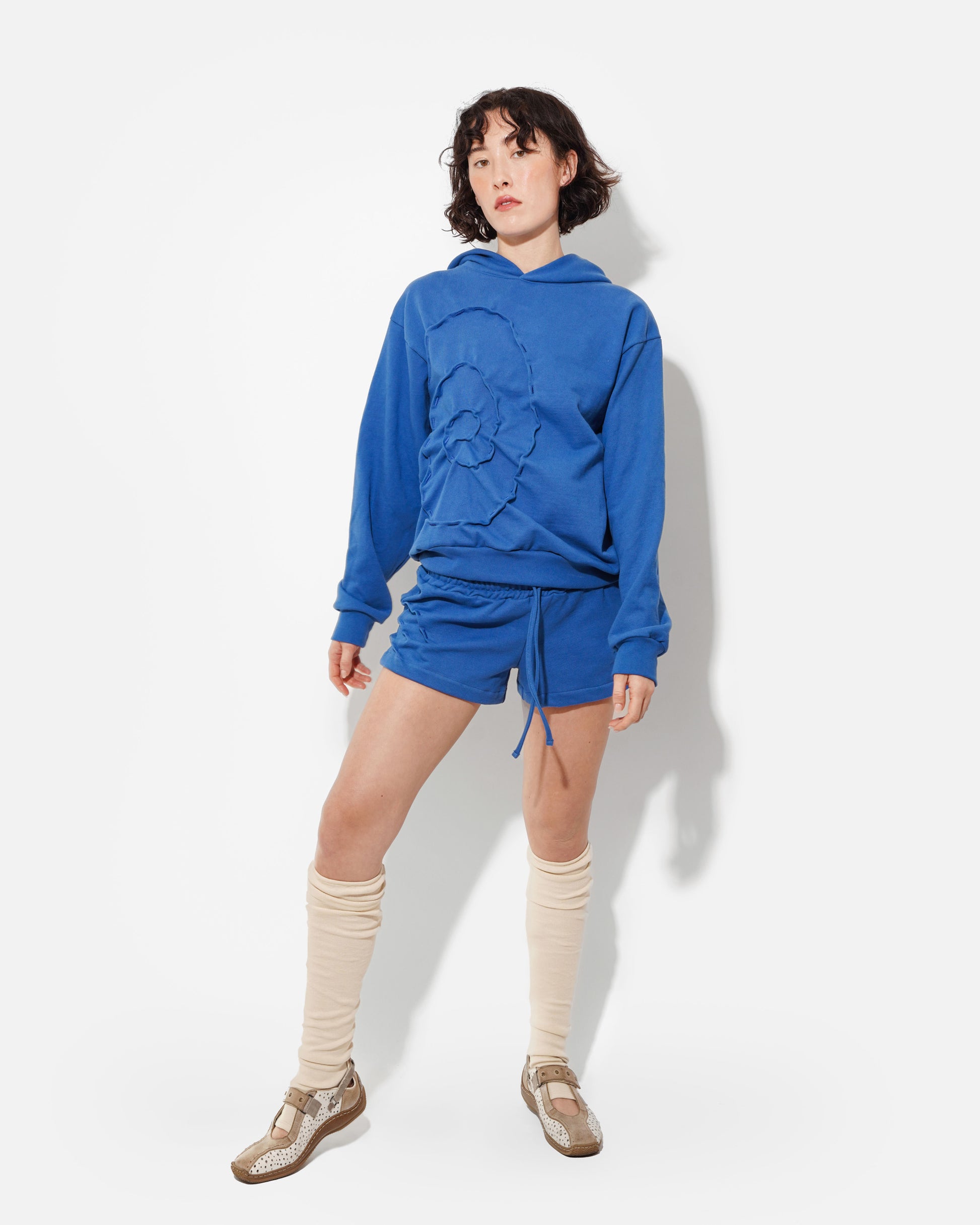 The perfect pair to our Ripple Hoodie, the Ripple Shorts are made from a cozy blue French cotton terry. Our stitching technique gathers the fabric on either side of the shorts, emulating the echo of a ripple and creating a slightly flared silhouette. The shorts have a drawstring waist and a back pocket to carry the special stones you collect while wading in the river.