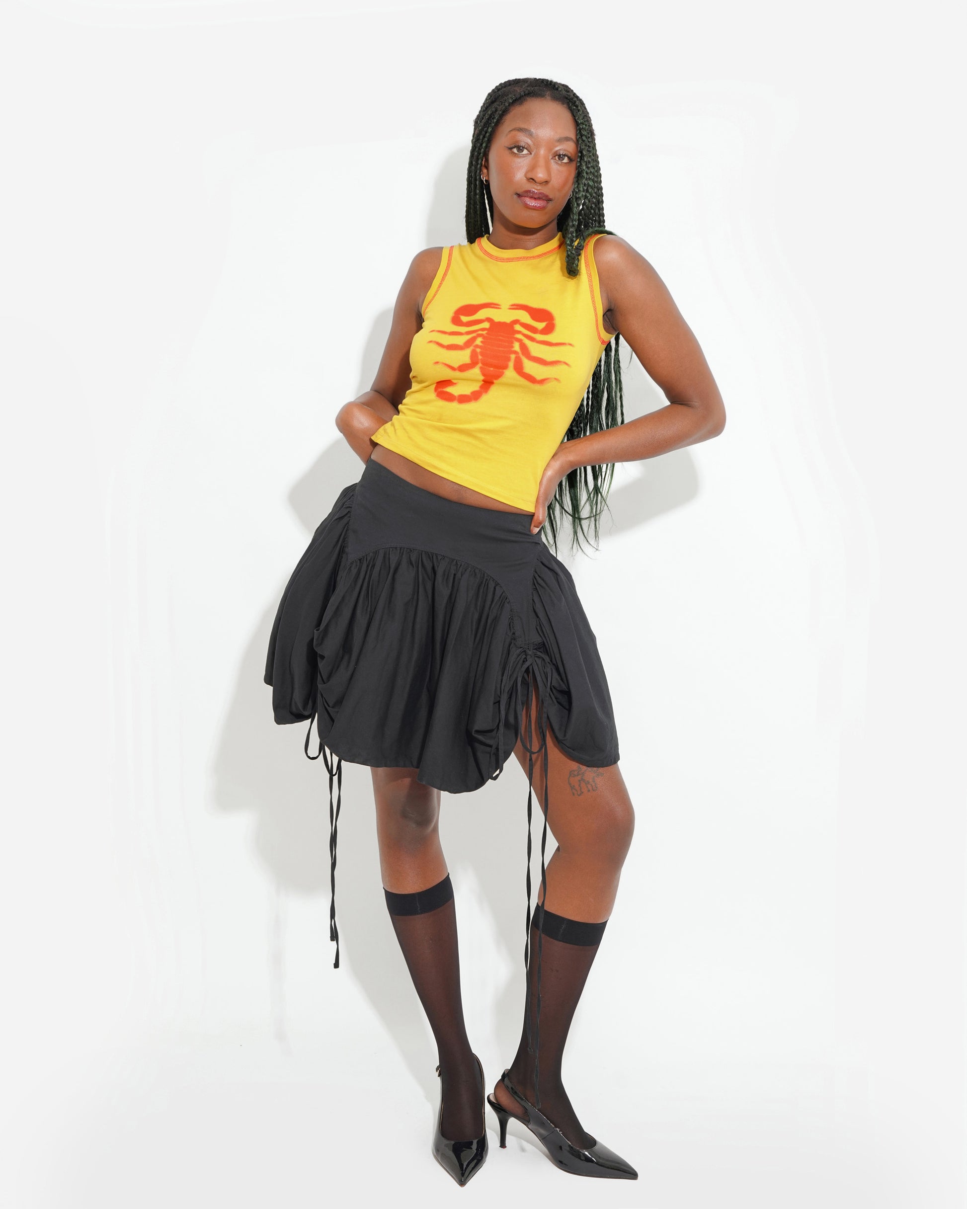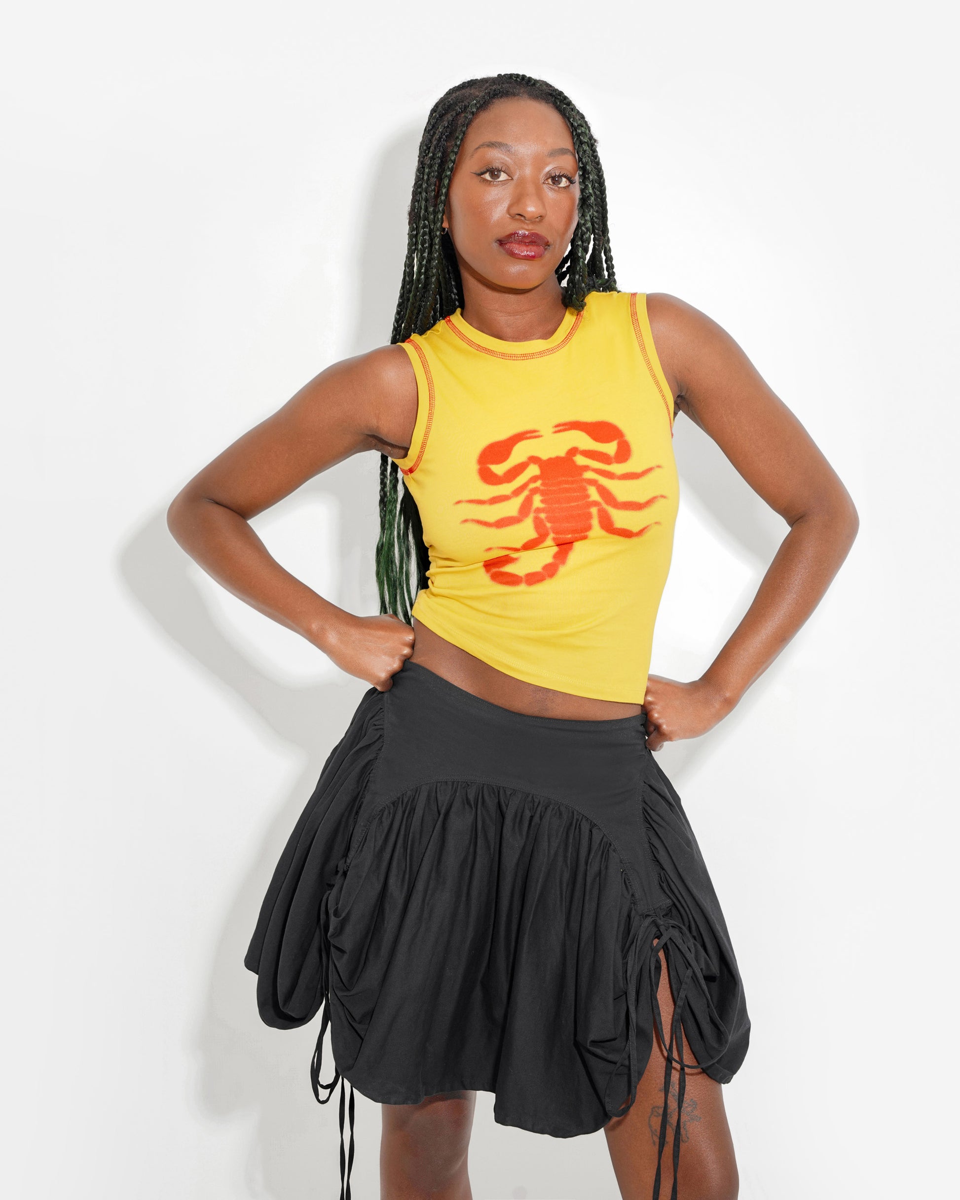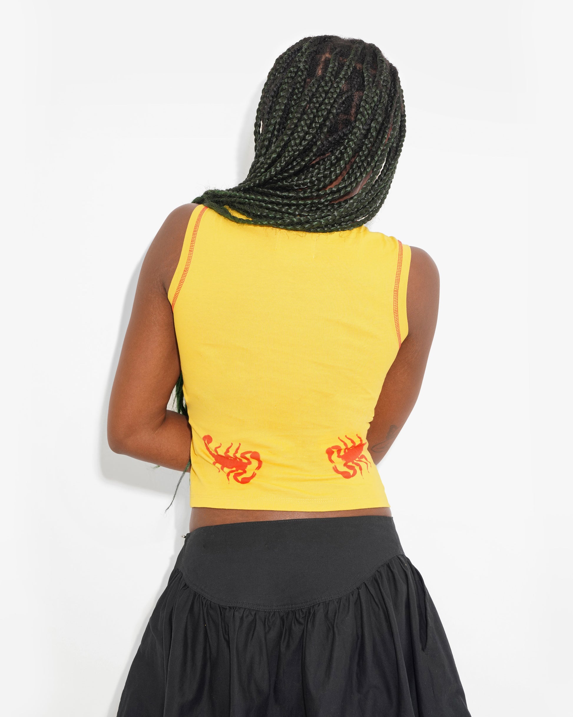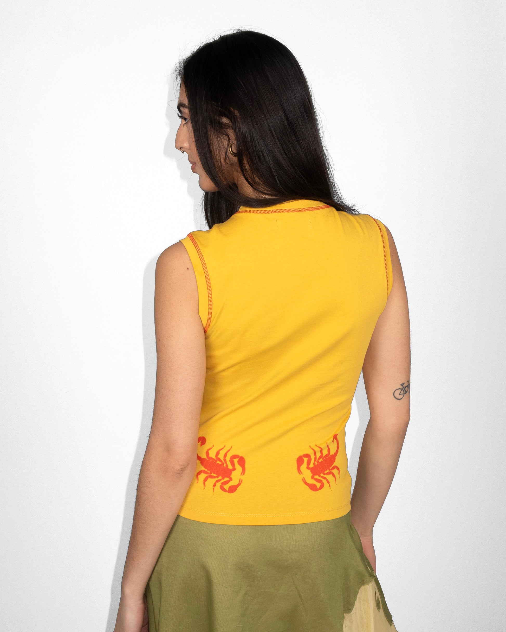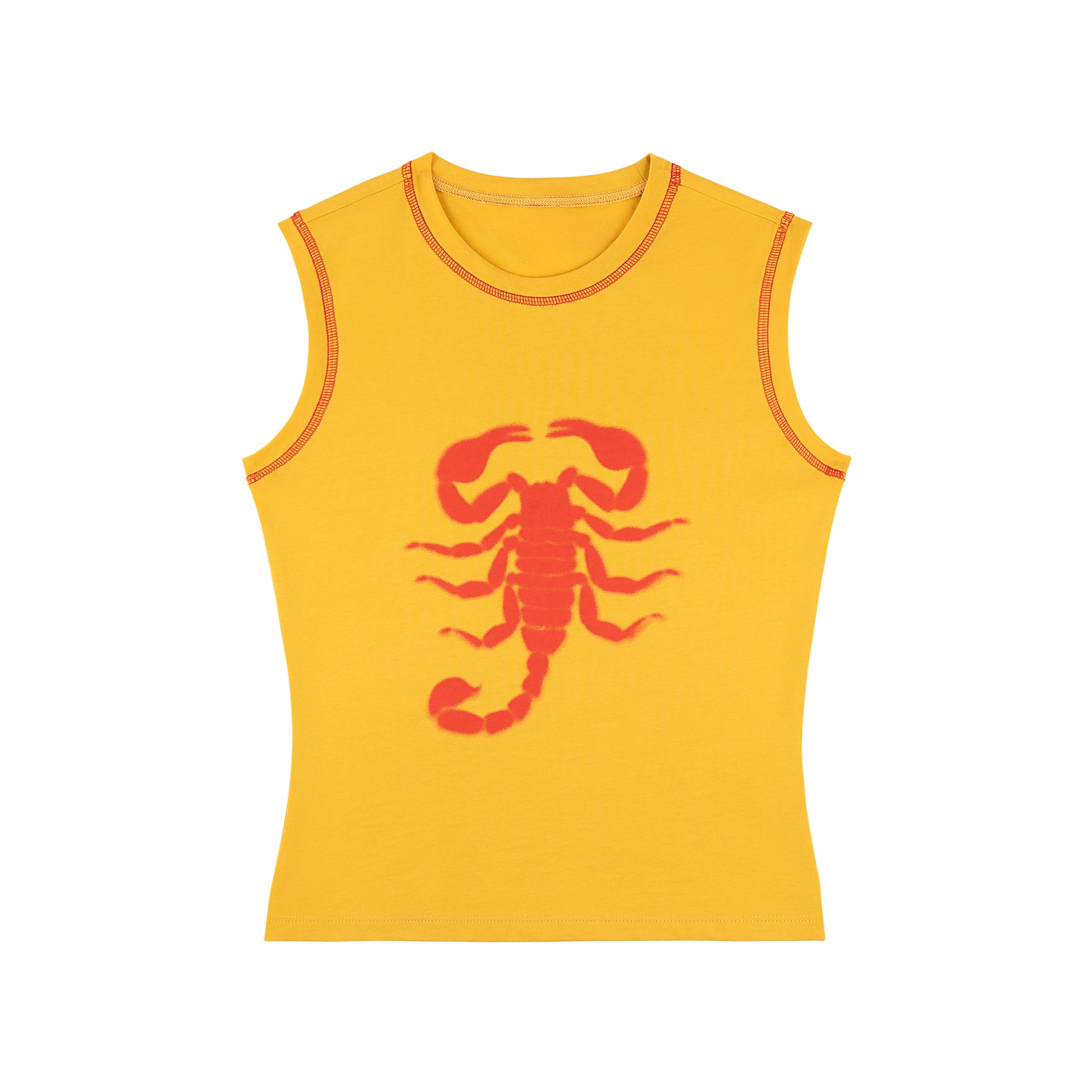Made in collaboration with Tyler McGillivary, the Scorpion Tank is a fitted crew neck tank with a full-length fit. Inspired by insects preserved in amber, it features an airbrushed scorpion on the chest and two tramp-stamp style scorpions on the lower back. Contrasting orange stitching orbits the arms and neckline.