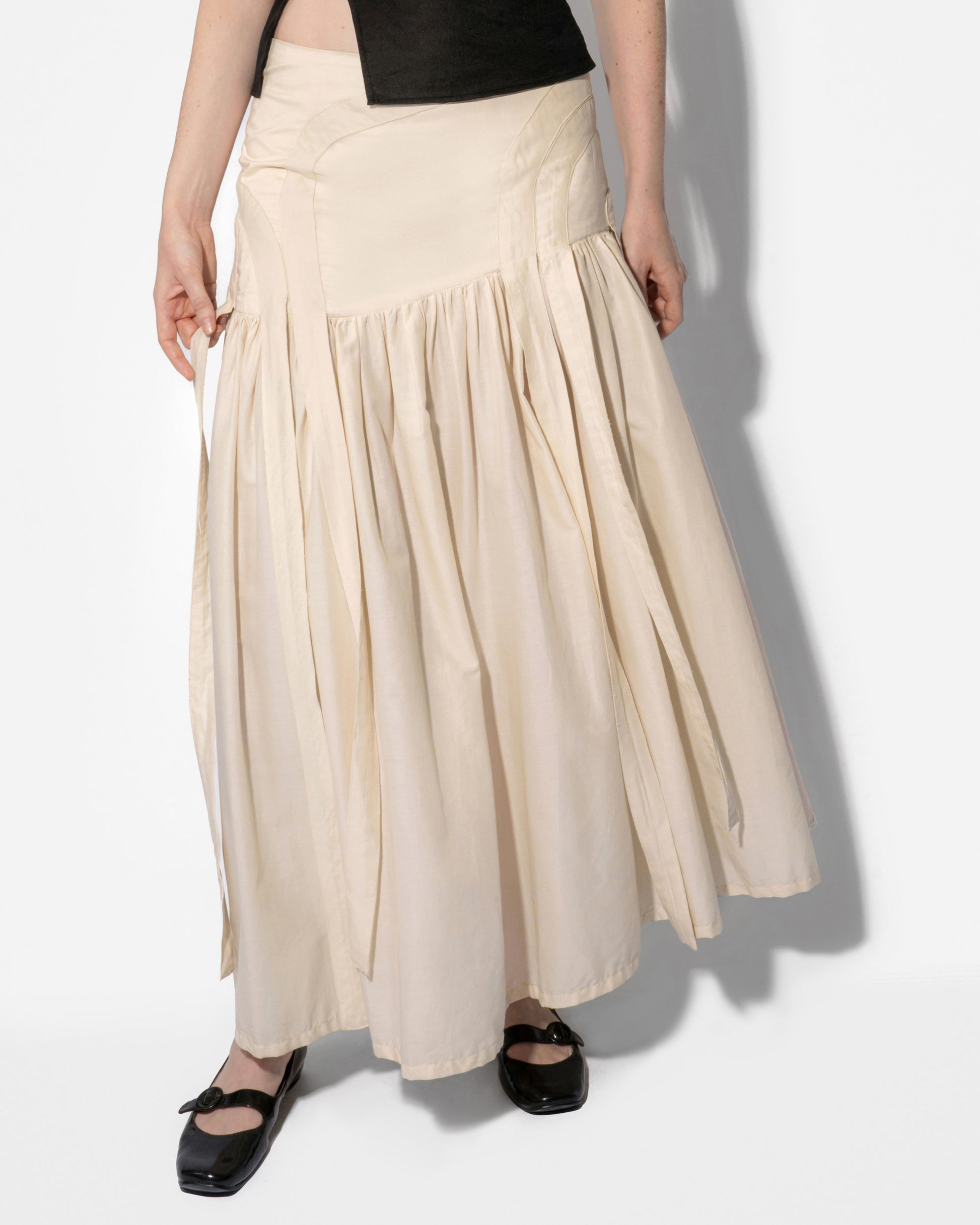 The Solstice Skirt features an asymmetrical drop waist yoke and a gathered skirt. Ornamental straps are topstitched onto the yoke, wrapping around the hips and cascading into the flow of the skirt. Made with a silky smooth cotton & lyocell fabric, lots of time, and the sun’s rays. Skirt sits low rise just above the hips.