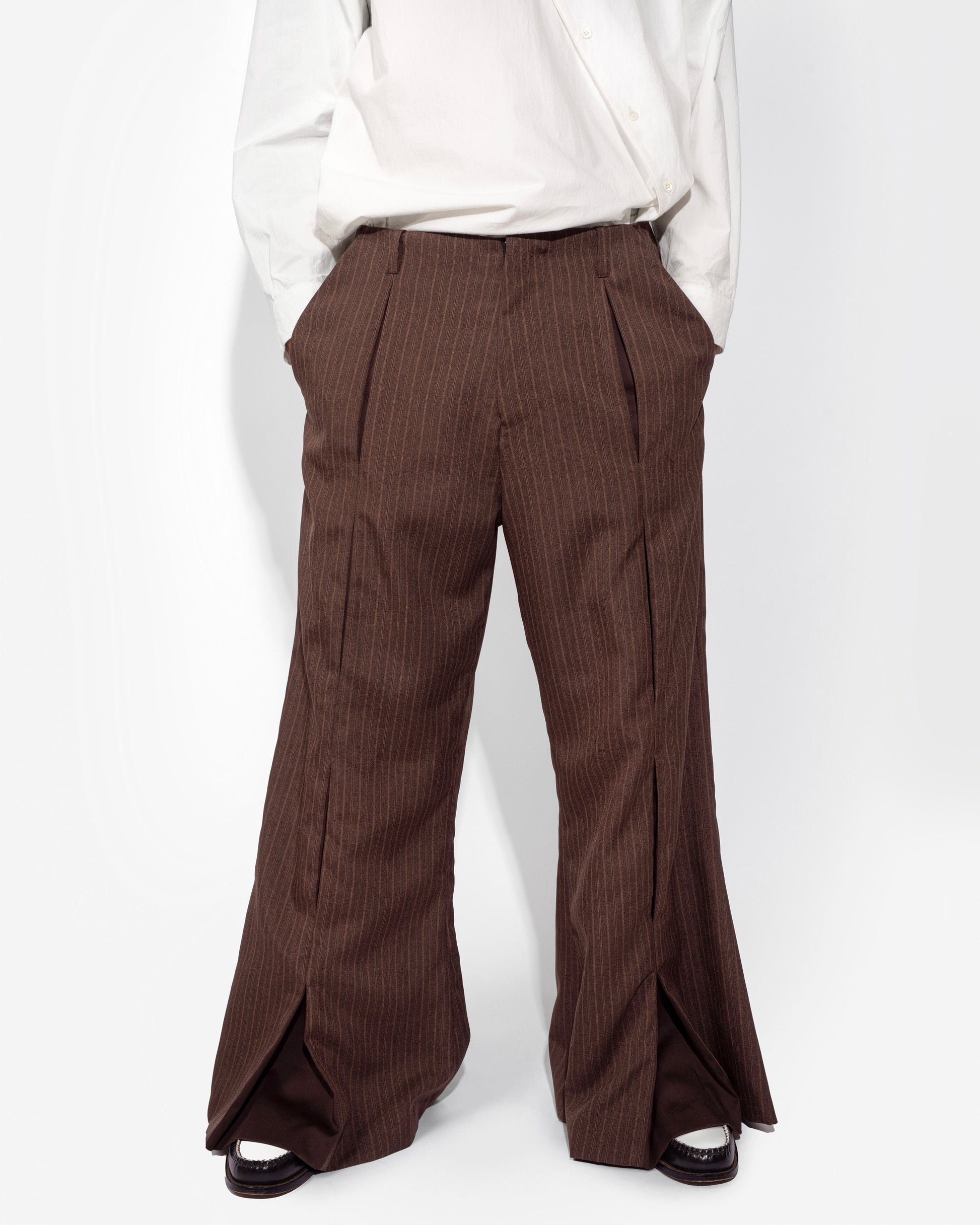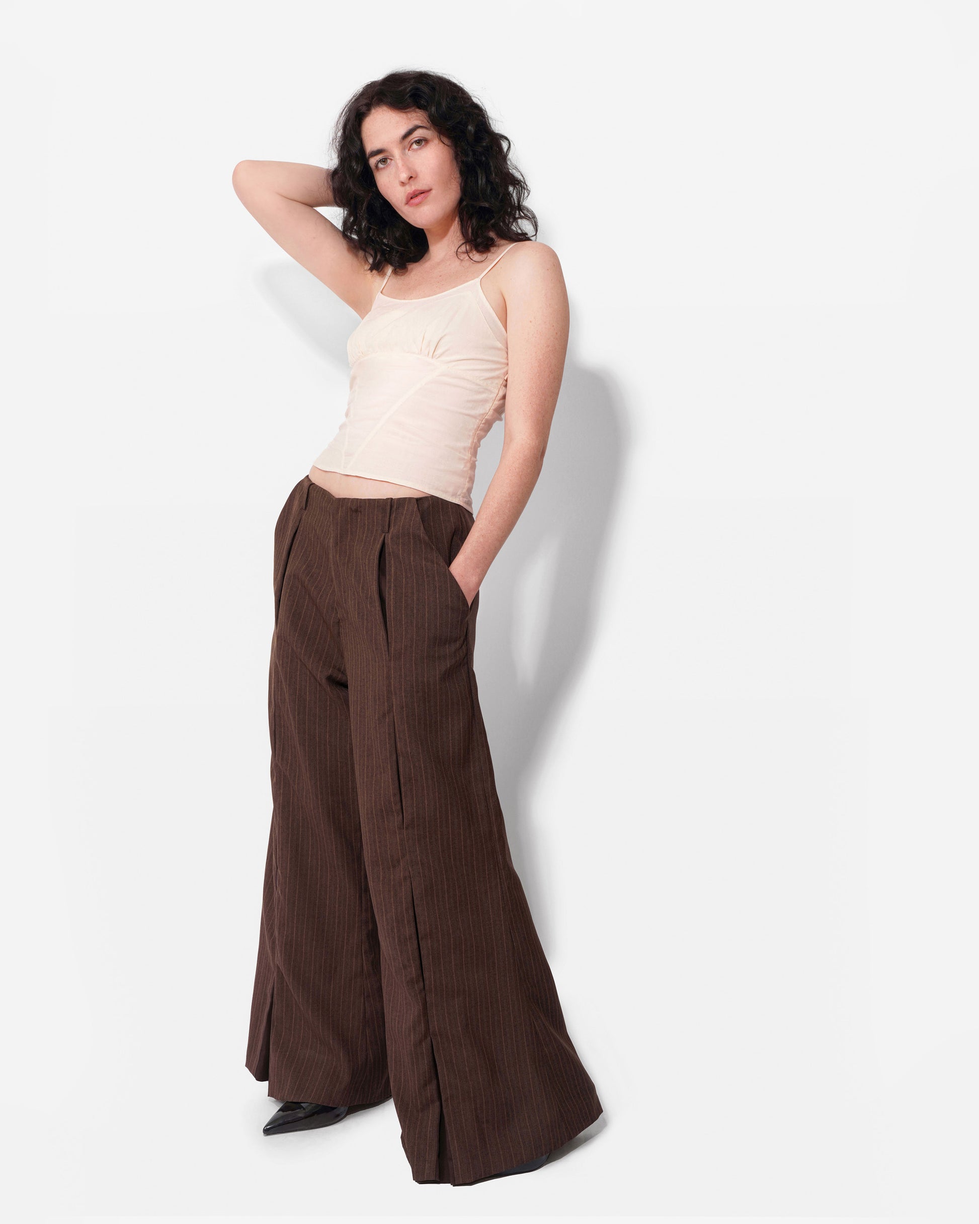The Sparrow Trousers feature a dual fabric construction and a wide flared leg. Inverted pleats run down the length of the pant, creating vertical gaps that reveal a secondary fabric beneath. The gaps move with you, opening and closing to reveal more or less fabric as you shift and flow through your day. The trousers are full length, sit just above the hips, and have a flared leg that narrows in slightly at the knee.