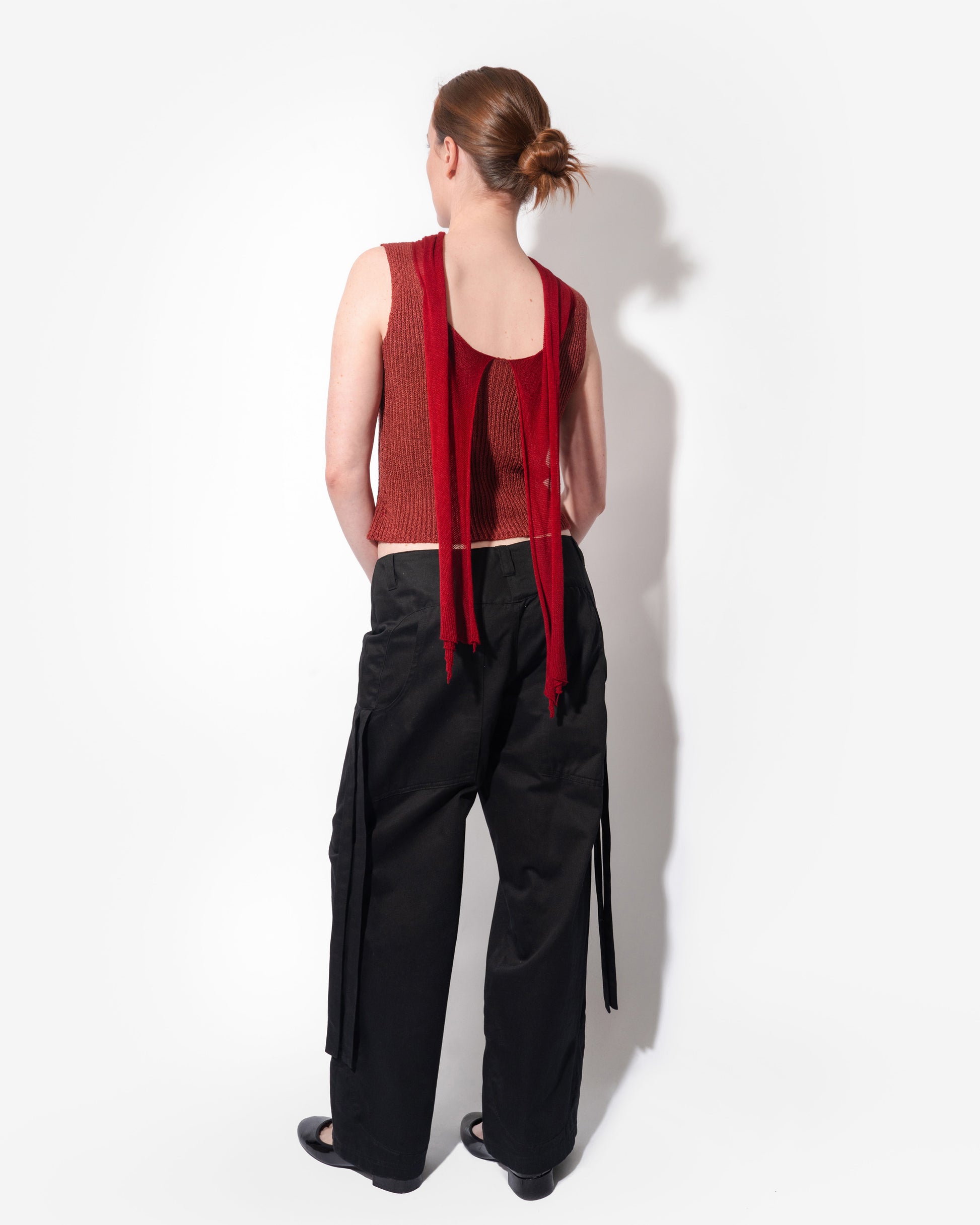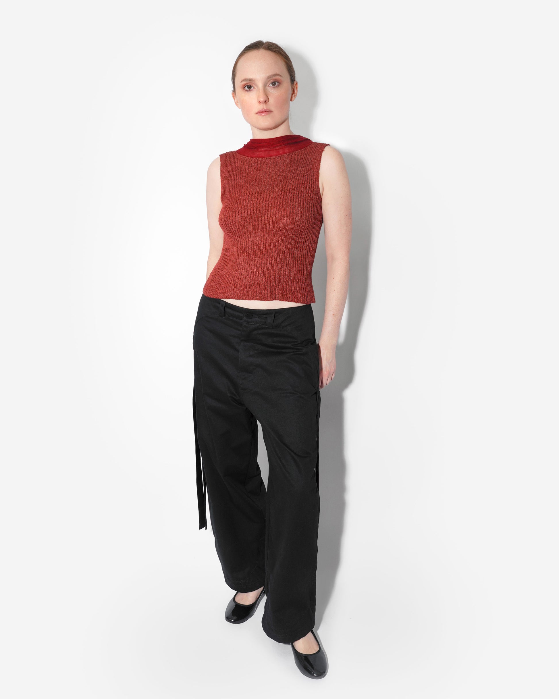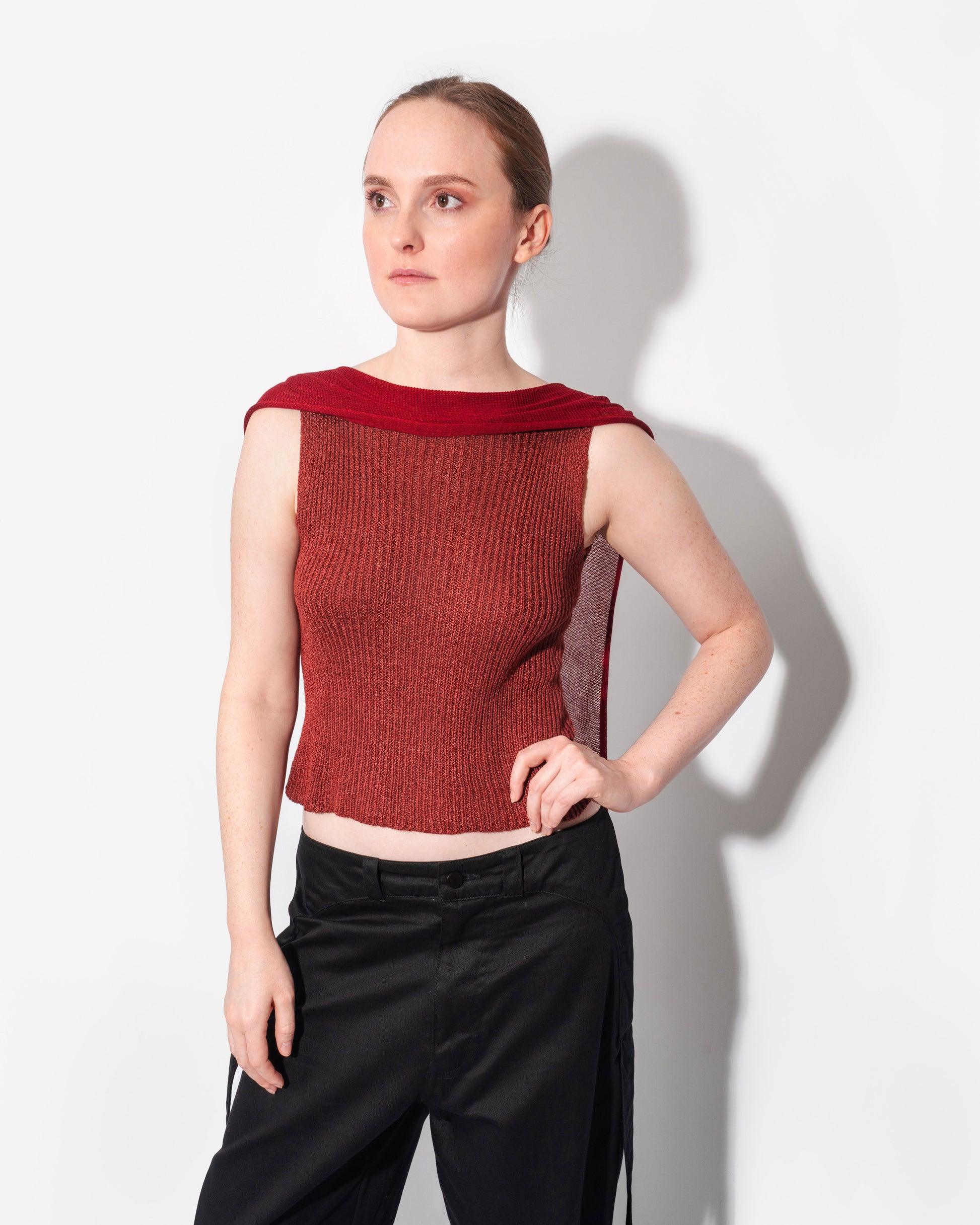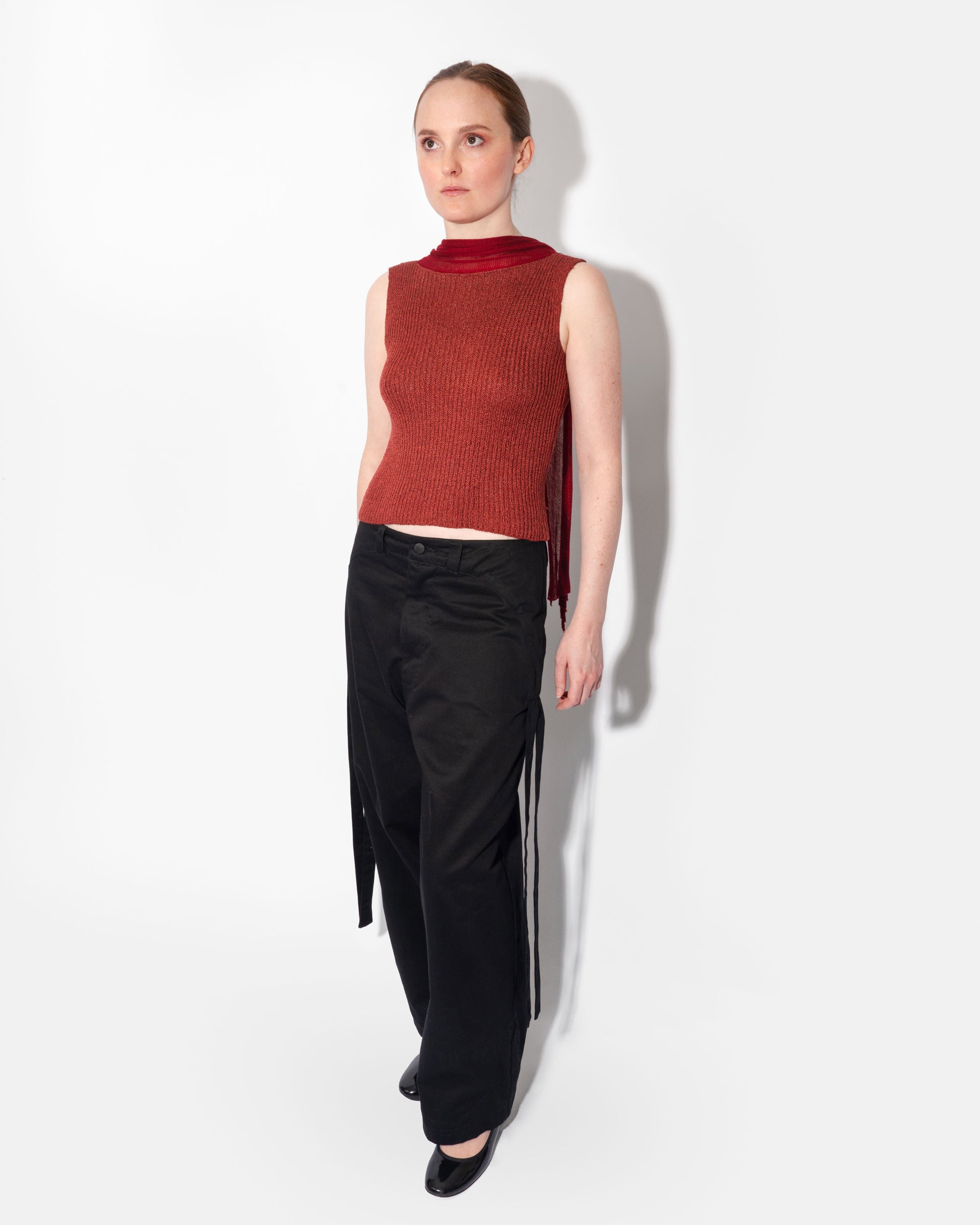 Made in collaboration with textile artist Camille Zacky, the Rosefinch Tank is a ribbed knit tank with a high neck and full length fit. An attached wing-like scarf cascades down the back of the top and can be worn in a variety of ways; over the shoulders, wrapped around the neck, tied in the back, the possibilities are vast as the sky.