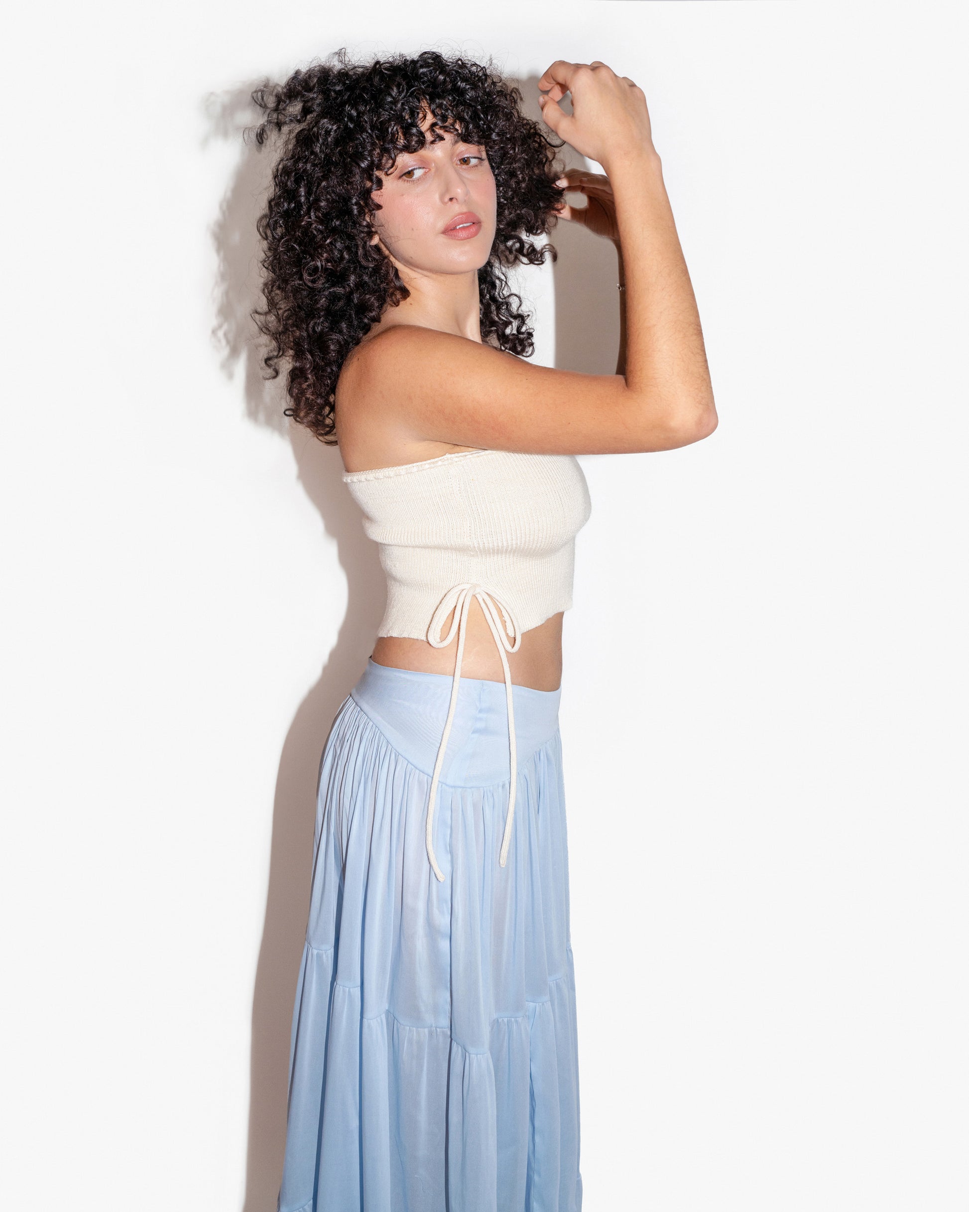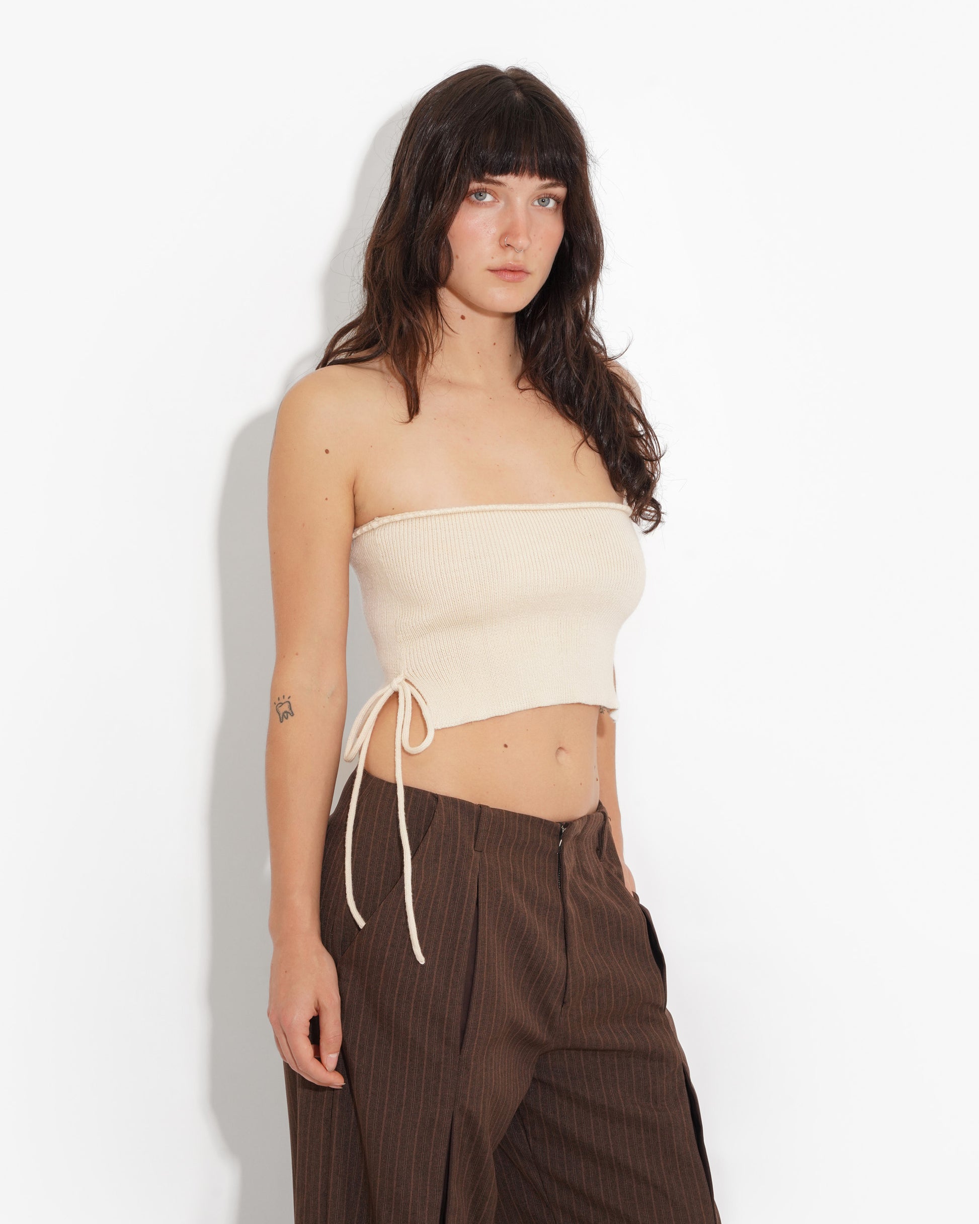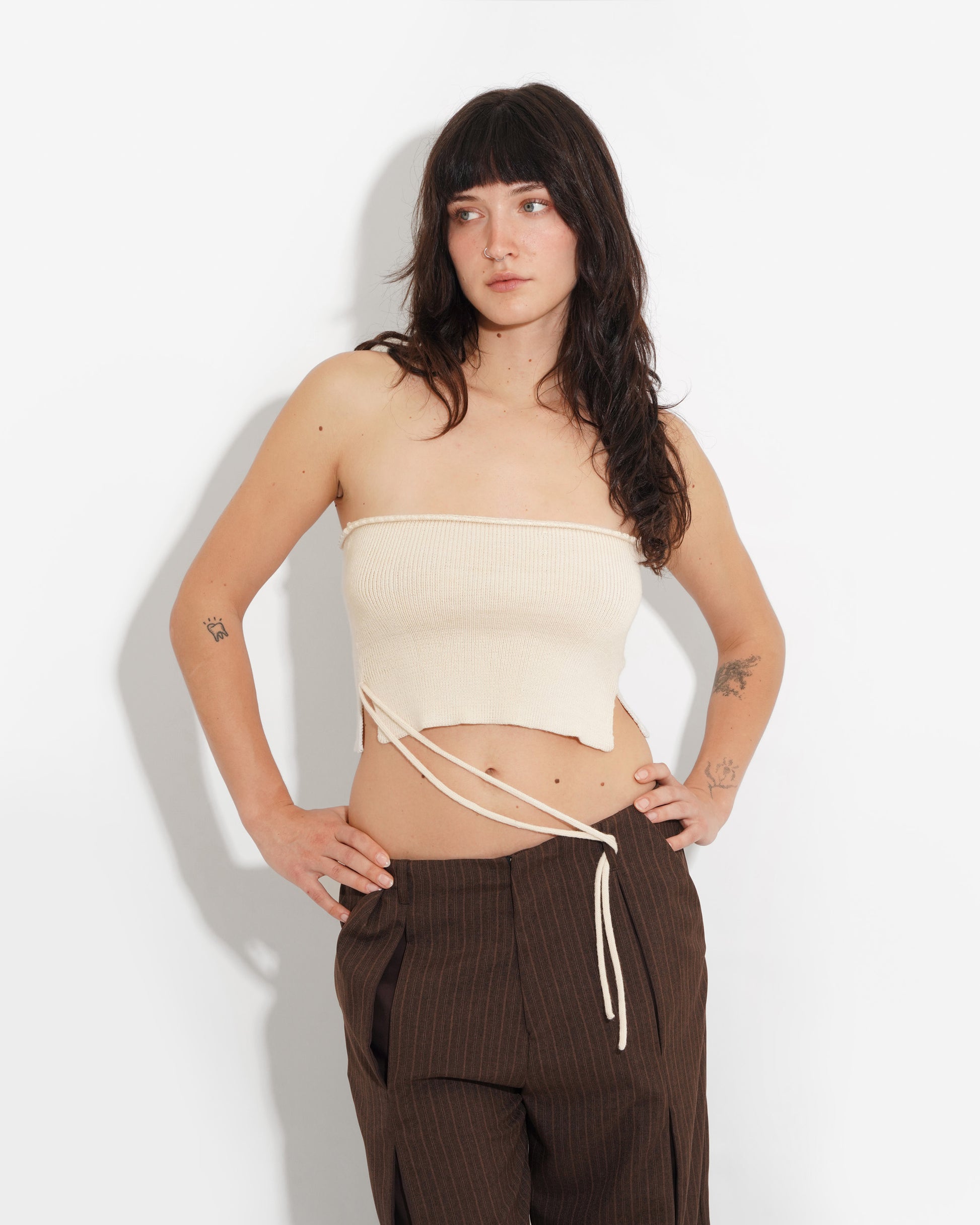 Olivia Bangham X Ella Mae knitwear. Hand knitted top made locally in Los Angeles CA. 100% wool tube top with scallop hem and slit side seams. String bow on right corner can be tied around waist as well. All knits are made to order so please allow 3 weeks for your order to ship