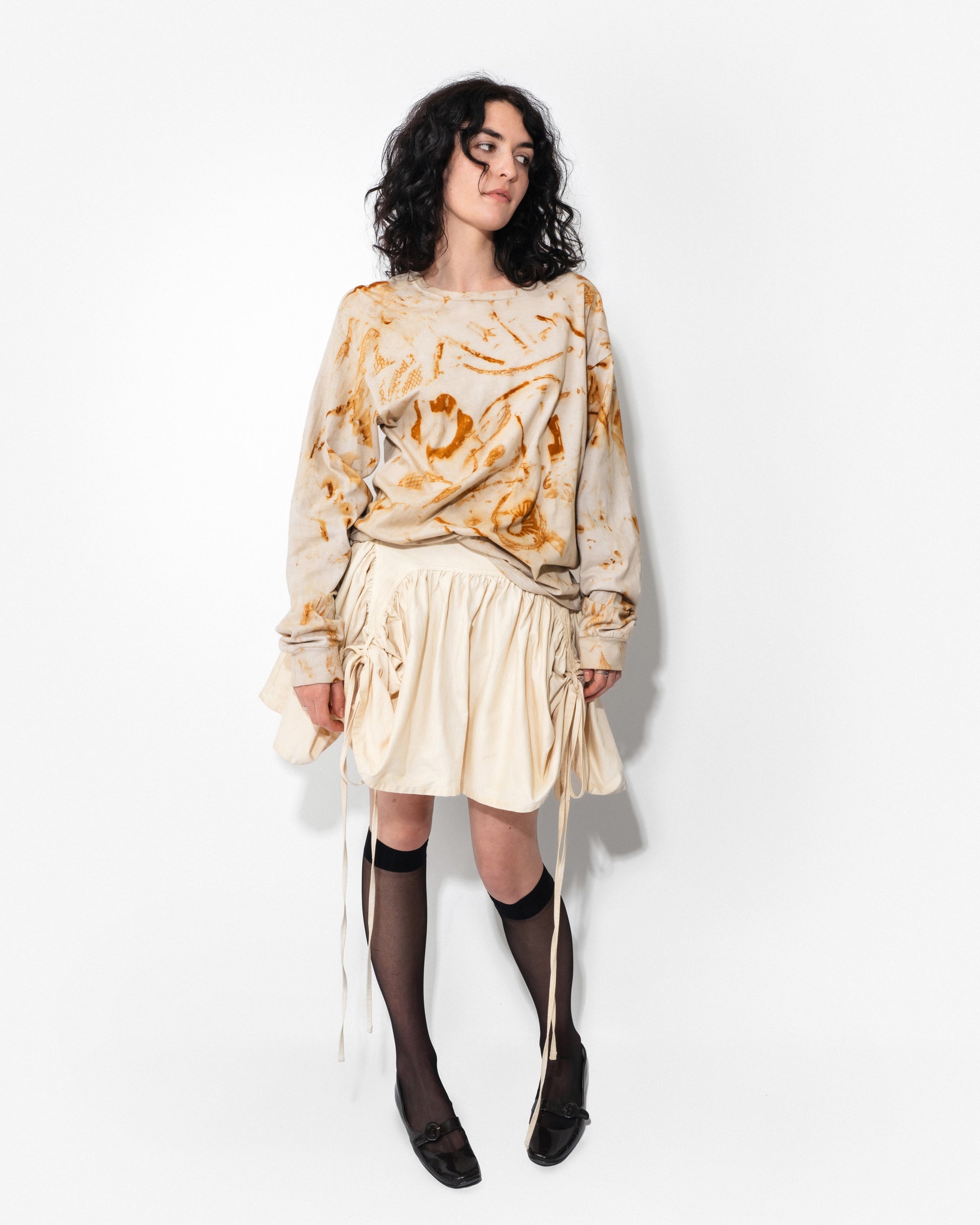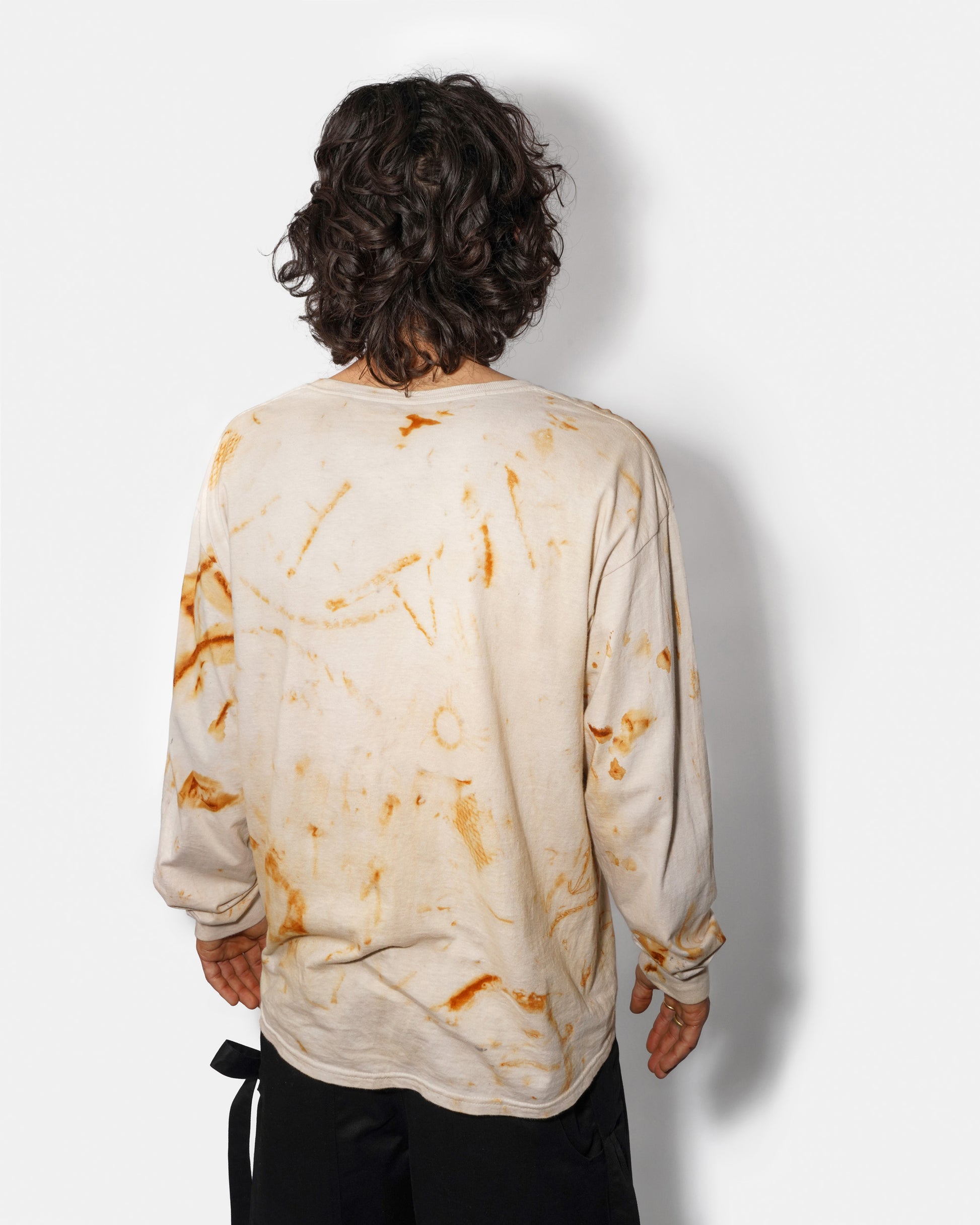 Inspired by the memories held within a loved one’s old toolbox, the Memory Box Boatneck is naturally dyed by hand using coffee and rusted metal objects. Wear the lingering impressions of a wrench, nails, and abstract golden shapes on this oversized long sleeve. The fit is slouchy with fitted cuffs for a gathered look at the wrists.
