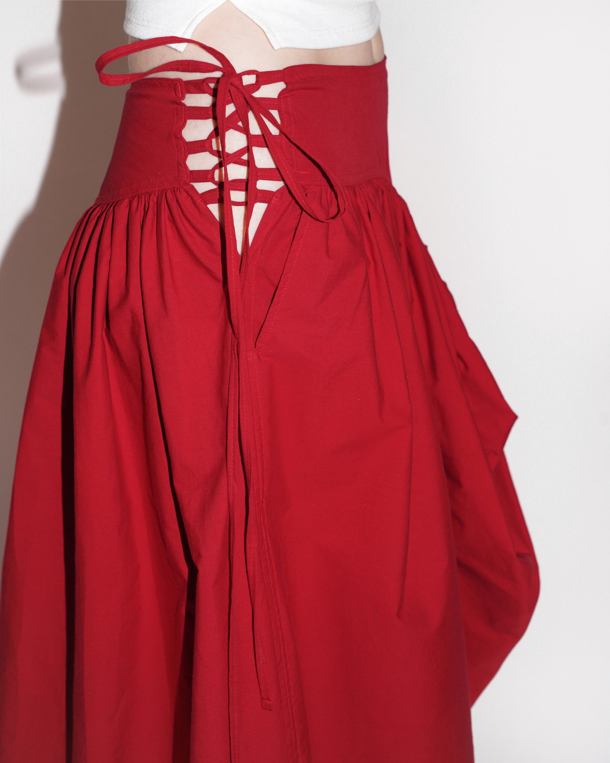 The Tulip Skirt is a gathered midi skirt in a bold red cotton. The asymmetrical, waterfalling yoke leads into ties that cinch and gather up the skirt on one side. Wear it long to a garden party, then tie it up to tromp through the forest. Features a slightly adjustable lace up side closure and two side pockets to carry your most precious forest finds. Skirt sits low rise just above the hips.