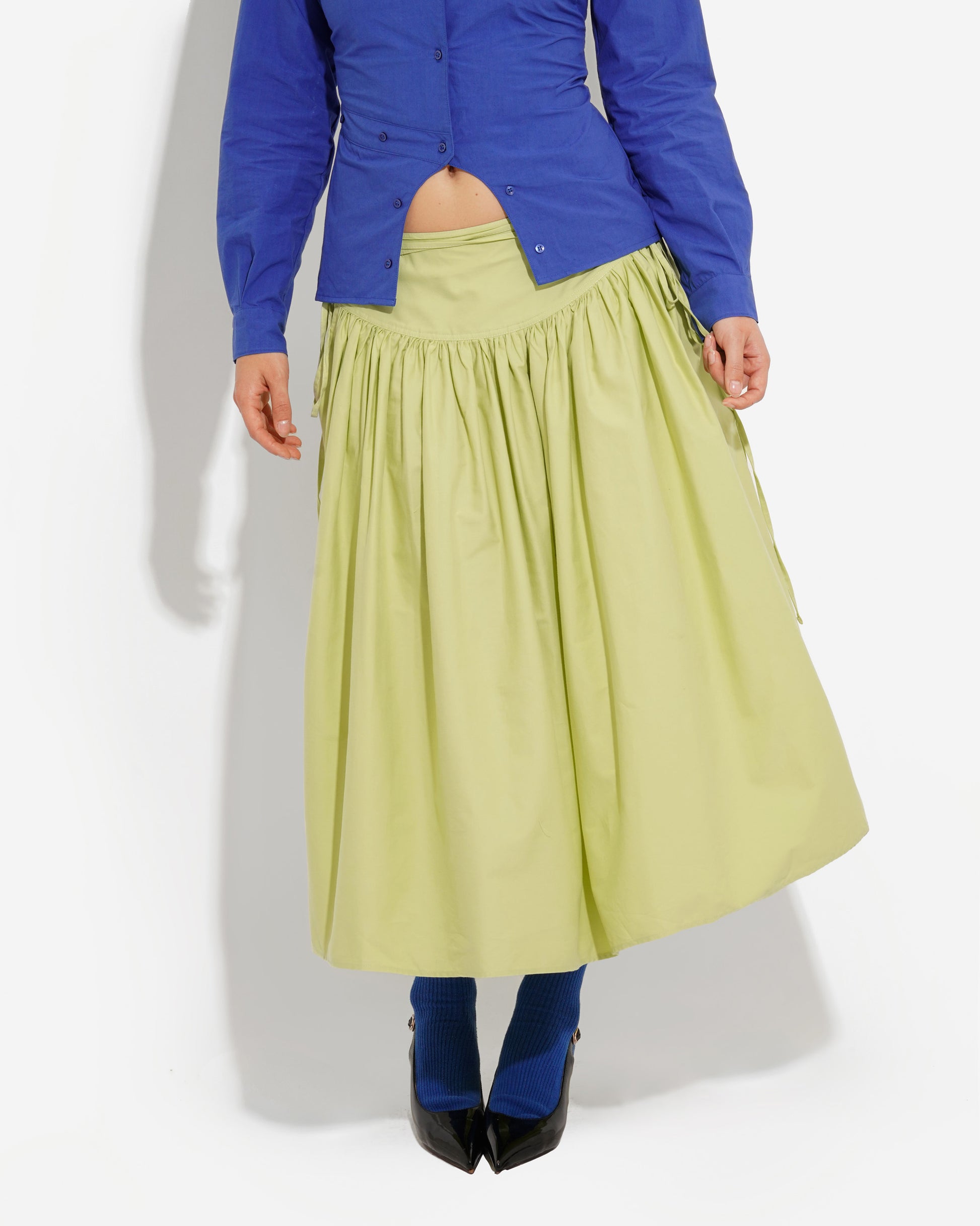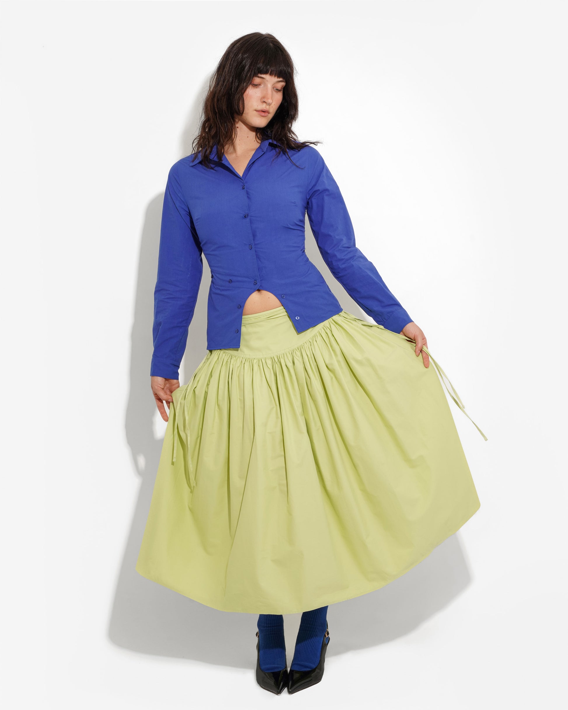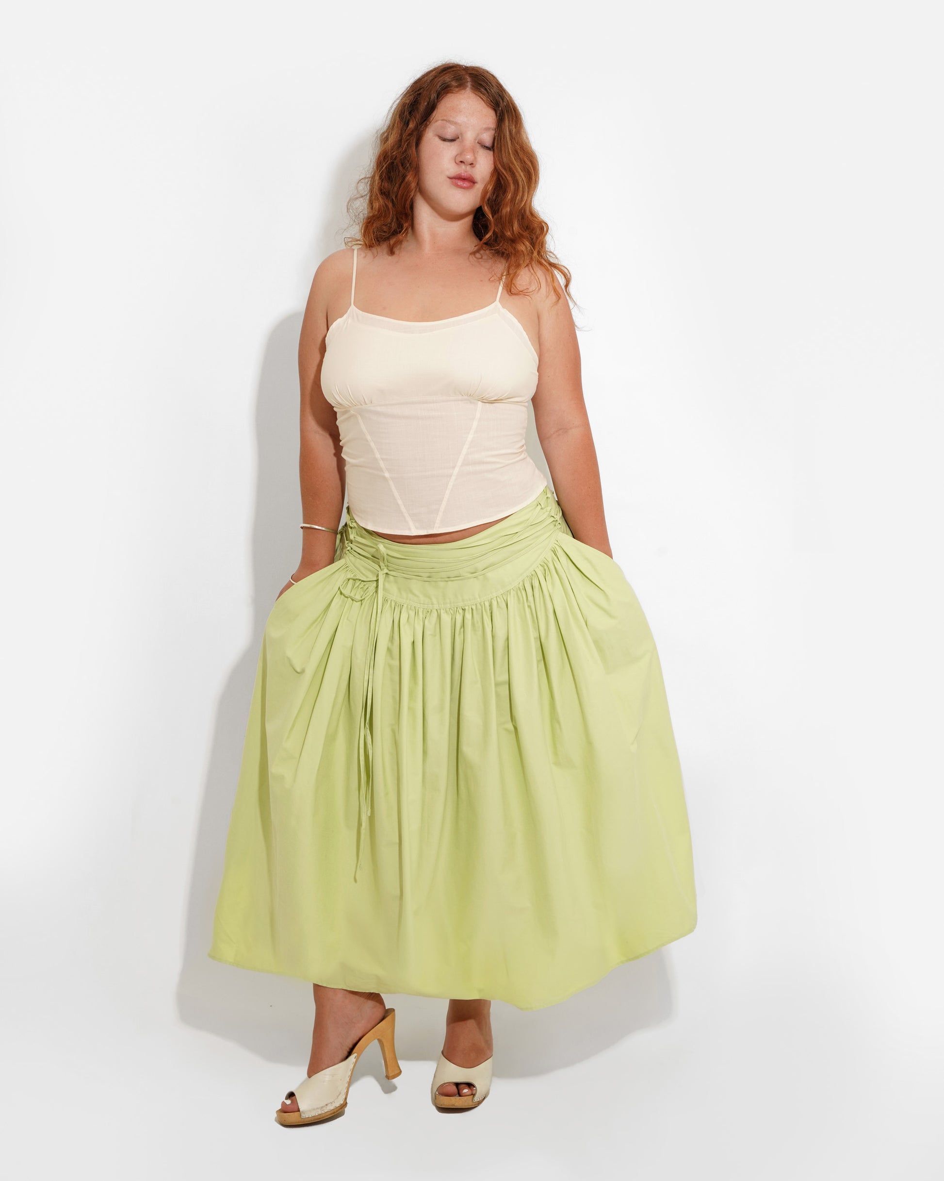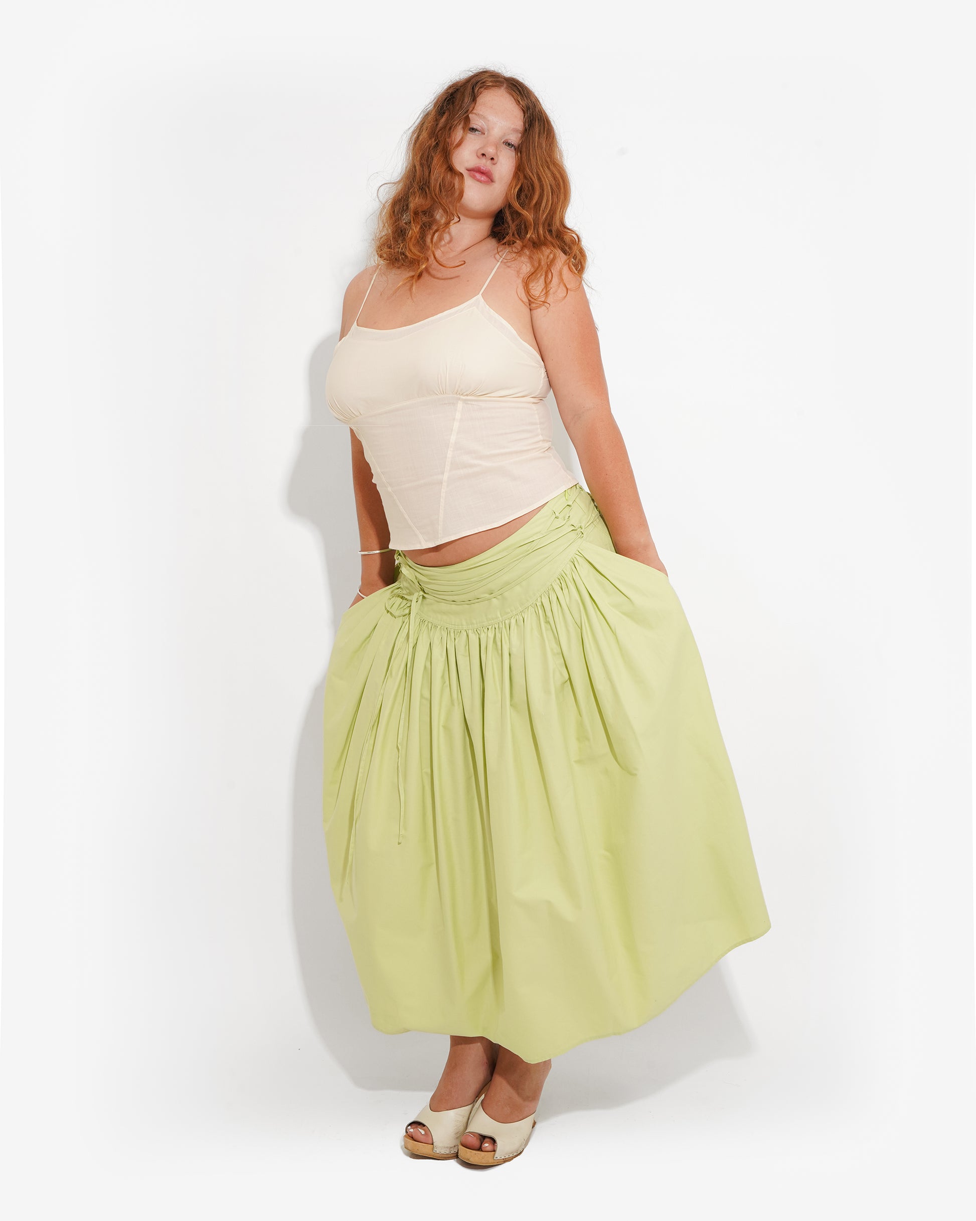 An Ella Mae classic, the best selling Twisting Vines Skirt is a gathered midi skirt with a drop waist. It features a gently curved yoke with ornamental ties that wrap, weave, and wind around the hips like vines on a wise old tree. The skirt has a slightly adjustable lace up side closure and two side pockets for carrying keepsakes and collecting shells. Skirt sits low rise just above the hips.